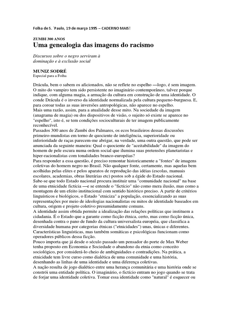Drcula, bem o sabem os aficionados, no se reflete no espelho logo, sem imagem. O mito do vampiro tem sido persistente no imaginrio contemporneo, talvez porque indique, com alguma magia, a armao da cultura em construo de uma identidade. O conde Drcula o inverso da identidade normalizada pela cultura pequeno-burguesa. E, para coroar todas as suas inverses antropolgicas, no aparece no espelho. Mais uma razo, assim, para a atualidade desse mito. Na sociedade da imagem (anagrama de magia) ou dos dispositivos de viso, o sujeito s existe se aparece no "espelho", isto , se tem condies socioculturais de ter imagem publicamente reconhecvel. Passados 300 anos de Zumbi dos Palmares, os ecos brasileiros dessas discusses primeiro-mundistas em torno de quociente de inteligncia, superioridade ou inferioridade de raas parecem-me abrigar, na verdade, uma outra questo, que pode ser anunciada da seguinte maneira: Qual o quociente de "aceitabilidade" da imagem do homem de pele escura numa ordem social que ilumina suas pretenses planetaristas e hiper-racionalistas com tonalidades branco-europias? Para responder a essa questo, preciso remontar historicamente a "fontes" de imagens coletivas do homem negro no Brasil. No qualquer fonte, certamente, mas aquelas bem acolhidas pelas elites e pelos aparatos de reproduo das idias (escolas, manuais escolares, academias, obras literrias etc) postos sob a gide do Estado nacional. Sabe-se que todo Estado nacional procura instituir uma "comunidade nacional" na base de uma etnicidade fictcia e se entende o "fictcio" no como mera iluso, mas como a montagem de um efeito institucional com sentido histrico preciso. A partir de critrios lingusticos e biolgicos, o Estado "etniciza" a populao, essencializando as suas representaes por meio de ideologias nacionalistas ou mitos de identidade baseados em cultura, origem e projeto coletivo presumidamente comuns. A identidade assim obtida permite a idealizao das relaes polticas que instituem a cidadania. o Estado que a garante como fico tnica, certo, mas como fico nica, desenhada contra o pano de fundo da cultura universalista europia, que classifica a diversidade humana por categorias tnicas ("etnicidades") unas, nicas e diferentes. Caractersticas lingusticas, mas tambm somticas e psicolgicas funcionam como operadores pblicos dessa fico. Pouco importa que j desde o sculo passado um pensador do porte de Max Weber tenha proposto em Economia e Sociedade o abandono da etnia como conceito sociolgico, por consider-lo cheio de ambiguidades e contradies. Na prtica, a etnicidade tem livre curso como dialtica de uma comunidade e uma histria, desenhando as linhas de uma identidade e uma diferena coletivas. A nao resulta de jogo dialtico entre uma herana comunitria e uma histria onde se constri uma entidade poltica. O imaginrio, o fictcio entram no jogo quando se trata de forjar uma identidade coletiva. Tomar essa identidade como "natural" esquecer ou