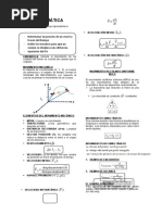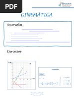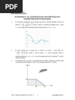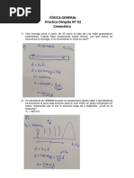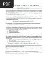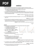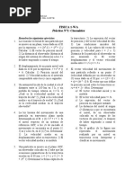 d) 36 m C5.- Un automvil toma una curva de 100 m de radio con velocidad constante de 36 km/h. Cules de las siguientes afirmaciones son correctas?: a) el coche no tiene aceleracin porque su velocidad es constante b) el coche tiene aceleracin porque su velocidad vara c) el coche tiene aceleracin tangencial d) la aceleracin del coche vale 1 m/s C6.- Las coordenadas del extremo del vector de posicin de una partcula mvil son P(2, -1) en un instante dado. Si el punto de referencia se encuentra en el origen de coordenadas: a) en ese instante el punto se encuentra en el plano xy b) el vector de posicin es r = 2.i - j c) el vector de posicin es r = i + 2.j d) no se puede definir este punto con un vector Qu afirmaciones son correctas? C7.- El vector de posicin de una partcula mvil es r = (t + 2).i + t .j Qu desplazamiento ha experimentado la partcula en el intervalo de tiempo de 2 a 4 s? C8.- El vector de posicin de una partcula es r = (4.t - 1).i + (t + 3).j (en unidades del S.I.): a) Deduce las expresiones de los vectores velocidad y aceleracin. b) Calcula la velocidad y aceleracin en el instante 1 s. C9.- El vector de posicin de un punto mvil es r = (2.t + 5.t ).i. a) el punto se mueve en el plano xy b) el punto se mueve sobre el eje x c) el punto se mueve sobre una recta paralela al eje x d) el movimiento es rectilneo uniforme e) la ecuacin dada es equivalente a la ecuacin x = 2t + 5t Seala las afirmaciones correctas. CINEMATICA: movimientos sencillos (tratamiento escalar) SEMEJANZA ENTRE ECUACIONES MOVIMIENTO RECTILINEO Y CIRCULAR MRUA (1) s = s0 + v0.t + a.t /2 (2) v = v0 + a.t (3) v - v0 = 2.a.(s - s0) MCUA (1) = 0 + v0.t + .t /2 (2) = 0 + .t (3) - 0 = 2..( - 0) Relacin entre magnitudes angulares y lineales: s = .R at = .R v = .R an = v /R = .R