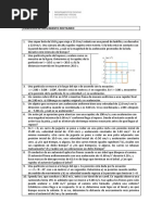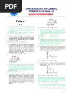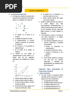 a) 12 755 m b) 51 s c) 402 (m/s) d) 8163.3 m P13.- Desde el borde de un pozo se deja caer una piedra. Si el sonido del choque de la piedra con el fondo se oye 5 segundos despus de haberla dejado caer y la velocidad del sonido es de 340 m/s, calcula la altura del pozo. Resultado nimo valiente!! (pista: hay que considerar dos tramos con diferente movimiento) (otra pista: un tramo podra ser el de bajada hasta chapotear; el otro el del sonido en subir) (y ya no hay ms pistas) MOVIMIENTO EN DOS DIMENSIONES MOVIMIENTO CIRCULAR P14.- Un ciclista parte del reposo en un veldromo circular de 50 m de radio y va movindose con movimiento uniformemente acelerado, hasta que, a los 50 s de iniciada su marcha, alcanza una velocidad de 36 km/h; desde este momento conserva su velocidad. Calcula: a) la aceleracin tangencial y la aceleracin angular en la primera etapa del movimiento b) la aceleracin normal y la aceleracin total en el momento de cumplirse los 50 s. c) la longitud de pista recorrida en los 50 s. d) la velocidad tangencial media y la velocidad angular media en la primera etapa del movimiento. e) el tiempo que tarda en dar una vuelta a la pista, con velocidad constante. f) el nmero de vueltas que da en 10 minutos, contados desde que inici el movimiento. Resultado a) at = 0.2 m/s = 0.004 rad/s b) an = 2 m/s a = 2.01 m/s c) s = 250 m d) vm = 5 m/s m = 0.1 rad/s e) t = 31.4 s f) 18.31 vueltas P15.- Un punto material describe una circunferencia de 2 m de radio con aceleracin constante. En el punto A la velocidad es de 0.5 m/s y transcurridos dos segundos la velocidad en b es 0.75 m/s. Calcula la aceleracin tangencial, normal y total en el punto A. Resultado at = 0.125 m/s an = 0.125 m/s a = 0.18 m/s P16.- Un mvil describe una trayectoria circular de 1 m de radio 30 veces por minuto (movimiento circular uniforme). Calcula: a) el perodo b) la frecuencia c) la velocidad angular d) la velocidad tangencial y la aceleracin centrpeta de ese movimiento Resultado a) T = 2 s/vuelta b) f = 0.5 vueltas/s c) = 3.14 rad/s d) v = 3.14 m/s an = 9.8 m/s LANZAMIENTO HORIZONTAL