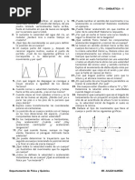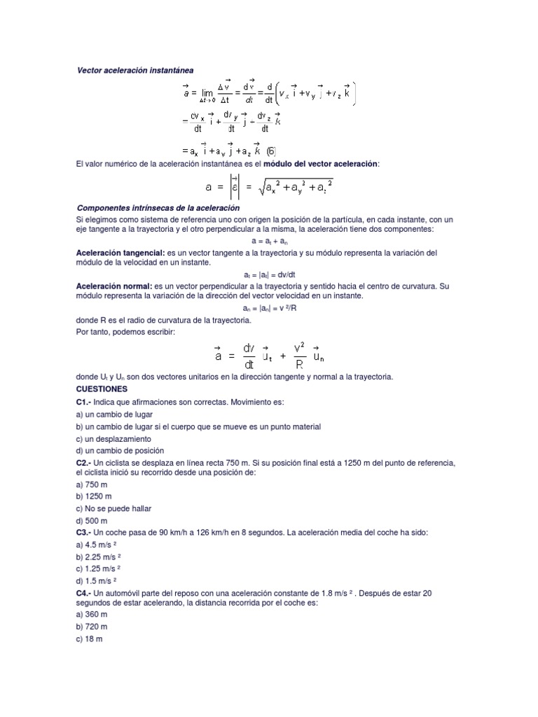 donde Ut y Un son dos vectores unitarios en la direccin tangente y normal a la trayectoria. CUESTIONES C1.- Indica que afirmaciones son correctas. Movimiento es: a) un cambio de lugar b) un cambio de lugar si el cuerpo que se mueve es un punto material c) un desplazamiento d) un cambio de posicin C2.- Un ciclista se desplaza en lnea recta 750 m. Si su posicin final est a 1250 m del punto de referencia, el ciclista inici su recorrido desde una posicin de: a) 750 m b) 1250 m c) No se puede hallar d) 500 m C3.- Un coche pasa de 90 km/h a 126 km/h en 8 segundos. La aceleracin media del coche ha sido: a) 4.5 m/s b) 2.25 m/s c) 1.25 m/s d) 1.5 m/s C4.- Un automvil parte del reposo con una aceleracin constante de 1.8 m/s . Despus de estar 20 segundos de estar acelerando, la distancia recorrida por el coche es: a) 360 m b) 720 m c) 18 m
