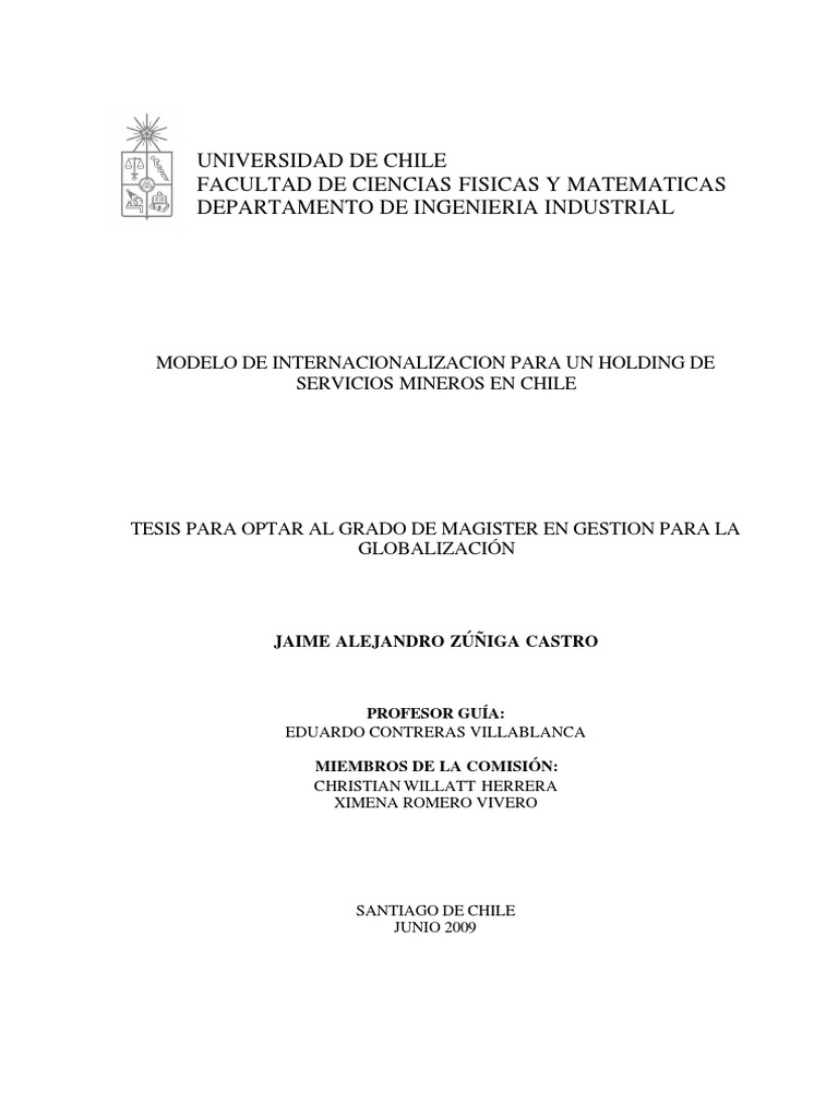 La presente tesis tiene como objetivo proponer una estrategia de internacionalizacin, para un holding chileno de servicios para la minera. El holding minero posee tres reas de especializacin: Servicios para la minera, fabricacin de equipos, partes y piezas, y servicios de ingeniera y diseo. El objetivo es estudiar los mercados de Per, Brasil y Argentina, y la identificacin de nuevas tendencias en servicios mineros. Las cifras de inversin en minera para el perodo 2008-2012 en Chile, Brasil, Argentina y Per corresponden a MMUS$14.300, MMUS$11.200, MM$6.800 y MMUS$11.600, respectivamente. Estos montos consideran importantes proyectos cuyo objetivo son metales como el cobre, oro, plata, hierro, nquel y aluminio. El contexto sobre el cual se ha desarrollado el presente trabajo, es en un escenario de alta incertidumbre, en el comienzo de una crisis global. Pese a ello, bajo el prisma de estrategia de largo plazo, se han analizado los pases en los cuales los proyectos de mayor envergadura no haban tenido variacin en sus plazos o proyecciones. En el anlisis interno desarrollado, se concluye que el holding posee ventajas competitivas en dos reas sobre las cuales se decide trabajar en el modelo de internacionalizacin. El holding posee experiencia y know how en la fabricacin de maquinaria, equipos, partes y piezas para perforacin y sondaje, de esta manera y aprovechando esta ventaja, se decide explorar en la lnea de negocios de servicios de perforacin y sondaje. Por otra parte, el anlisis externo nos lleva a concluir que los servicios de perforacin y sondaje poseen una alta demanda, tanto en chile como en los pases seleccionados para el proceso de internacionalizacin. En este sentido se presenta una oportunidad de negocios, bajo un servicio especfico de perforacin y sondaje, en el cual el holding posee experiencia, know how y ventaja competitiva en costos con respecto a las empresas competidoras. El holding posee una estructura administrativa liviana, un esquema de precios con los cuales se presenta a las propuestas y una gestin en optimizacin de los recursos humanos, que hace generar una propuesta de valor atractiva para los clientes. De los pases analizados, Per es el que presenta las mayores oportunidades. Posee estabilidad poltica, econmica y social, en trminos macroeconmicos es el pas de la regin con la mayor proyeccin de crecimiento, con un 6% para el 2009, especialmente impulsado por la minera. El modelo de internacionalizacin propuesto se basa en la generacin de alianzas estratgicas para penetrar en el mercado peruano para el ao 2009 con el servicio de perforacin y sondaje para la industria minera, para posteriormente expandirse con la exportacin de maquinaria, partes y piezas. Brasil es el segundo pas mas atractivo, sin embargo la minera posee singularidades que hace preciso estudiar durante el 2009 para continuar el proceso de internacionalizacin de servicios durante el 2010. Finalmente el modelo de internacionalizacin ha sido validado empricamente, ya que al cierre de este informe los ejecutivos del holding se encuentran preparando las propuestas tcnico-econmicas para las reuniones en Per, as como tambin un viaje para cerrar contratos y explorar el ambiente para futuros negocios basados en la alianza estratgica que se encuentran estudiando, dada la propuesta recibida de un conglomerado peruano de prestacin de servicios comerciales para la industria minera peruana. 2