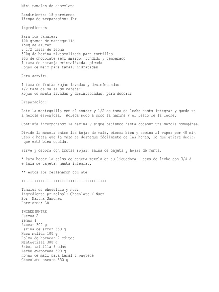 150g de azcar 2 1/2 tazas de leche 570g de harina nixtamalizada para tortillas 90g de chocolate semi amargo, fundido y temperado 1 taza de naranja cristalizada, picada Hojas de maz para tamal, hidratadas Para servir: 1 taza de frutas rojas lavadas y desinfectadas 1/2 taza de salsa de cajeta* Hojas de menta lavadas y desinfectadas, para decorar Preparacin: Bate la mantequilla con el azcar y 1/2 de taza de leche hasta integrar y quede un a mezcla esponjosa. Agrega poco a poco la harina y el resto de la leche. Contina incorporando la harina y sigue batiendo hasta obtener una mezcla homognea. Divide la mezcla entre las hojas de maz, cierra bien y cocina al vapor por 40 min utos o hasta que la masa se despegue fcilmente de las hojas, lo que quiere decir, que est bien cocida. Sirve y decora con frutas rojas, salsa de cajeta y hojas de menta. * Para hacer la salsa de cajeta mezcla en tu licuadora 1 taza de leche con 3/4 d e taza de cajeta, hasta integrar. ** estos los rellenaron con ate ++++++++++++++++++++++++++++++++++++++++ Tamales de chocolate y nuez Ingrediente principal: Chocolate / Nuez Por: Martha Snchez Porciones: 30 INGREDIENTES Huevos 2 Yemas 4 Azcar 300 g Harina de arroz 350 g Nuez molida 100 g Polvo de hornear 2 cditas Mantequilla 300 g Sabor vainilla 3 cdas Leche evaporada 390 g Hojas de maz para tamal 1 paquete Chocolate oscuro 350 g