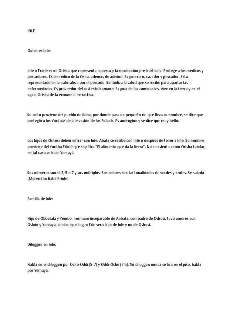 Inle o Erinl es un Orisha que representa la pesca y la recoleccin pre-hortcola. Protege a los mdicos y pescadores. Es el mdico de la Osha, adems de adivino. Es guerrero, cazador y pescador. Est representado en la naturaleza por el pescado. Simboliza la salud que se recibe para apartar las enfermedades. Es proveedor del sustento humano. Es gua de los caminantes. Vive en la tierra y en el agua. Orisha de la economa extractiva.