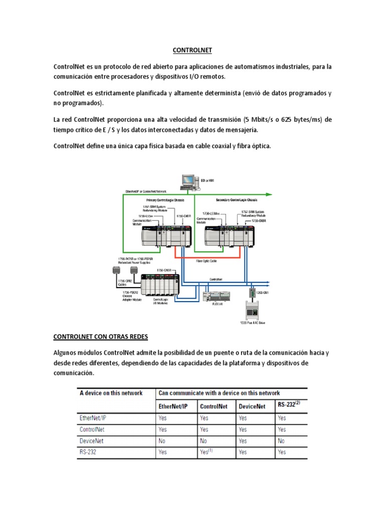 remotos. ControlNet es estrictamente planificada y altamente determinista (envi de datos programados y no programados). La red ControlNet proporciona una alta velocidad de transmisin (5 Mbits/s o 625 bytes/ms) de tiempo crtico de E / S y los datos interconectadas y datos de mensajera. ControlNet define una nica capa fsica basada en cable coaxial y fibra ptica.