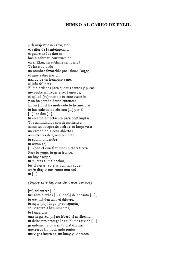 Oh majestuoso carro, Enlil, el seor de la inteligencia, el padre de los dioses , habl sobre tu construccin, en el Ekur, su sublime santuario! Te ha sido dado un nombre favorable por Ishme !agan, el mu" sabio pastor, nacido de un hermoso seno, el jefe del pa#s$ El dio rdenes para %ue tus santos " puros me pudieran llegar a ser famosos, &l aplic 'su( mano a tu construccin " no ha parado desde entonces$ En su )$$$* &l ha motivado tu hermosura, t+ has sido colocado con )$$$* por &l$ )$$$* los dos )$$$*, t+ eres un espect,culo para contemplar$ Tus admin#culos son descollantes, como un bos%ue de cedros- tu larga vara , un campo de surcos abiertos, abundanc#a de grano reciente. tu sudin, una nube, tu ar/n '0( )$$$ 'con el cual(* t+ unes cielo " tierra$ 1ara tu "ugo, tu gran tronco, no ha" escape, t+ sujetas al malhechor, tus clavijas )sujetas con una soga* est,n dispuestas como una red, tu )$$$*$