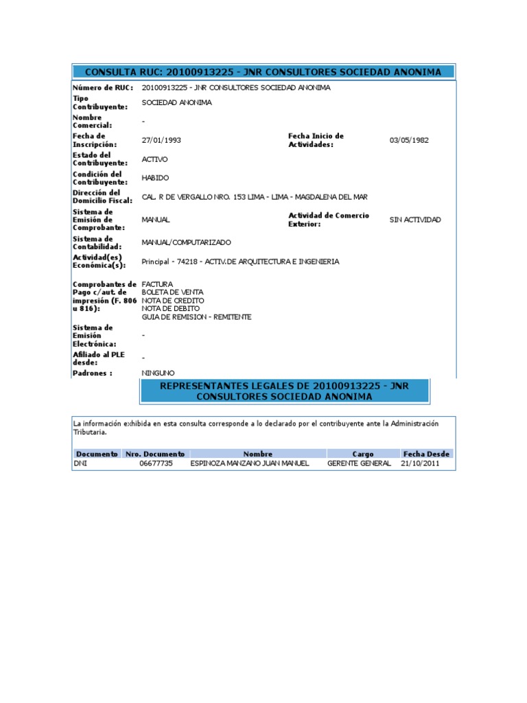 Nmero de RUC: Tipo Contribuyente: Nombre Comercial: Fecha de Inscripcin: Estado del Contribuyente: Condicin del Contribuyente: Direccin del Domicilio Fiscal: Sistema de Emisin de Comprobante: Sistema de Contabilidad: Actividad(es) Econmica(s): Comprobantes de Pago c/aut. de impresin (F. 806 u 816): Sistema de Emisin Electrnica: Afiliado al PLE desde: Padrones : 20100913225 - JNR CONSULTORES SOCIEDAD ANONIMA SOCIEDAD ANONIMA 27/01/1993 ACTIVO HABIDO CAL. R DE VERGALLO NRO. 153 LIMA - LIMA - MAGDALENA DEL MAR MANUAL MANUAL/COMPUTARIZADO Principal - 74218 - [Link] ARQUITECTURA E INGENIERIA FACTURA BOLETA DE VENTA NOTA DE CREDITO NOTA DE DEBITO GUIA DE REMISION - REMITENTE NINGUNO Actividad de Comercio Exterior: SIN ACTIVIDAD Fecha Inicio de Actividades: 03/05/1982