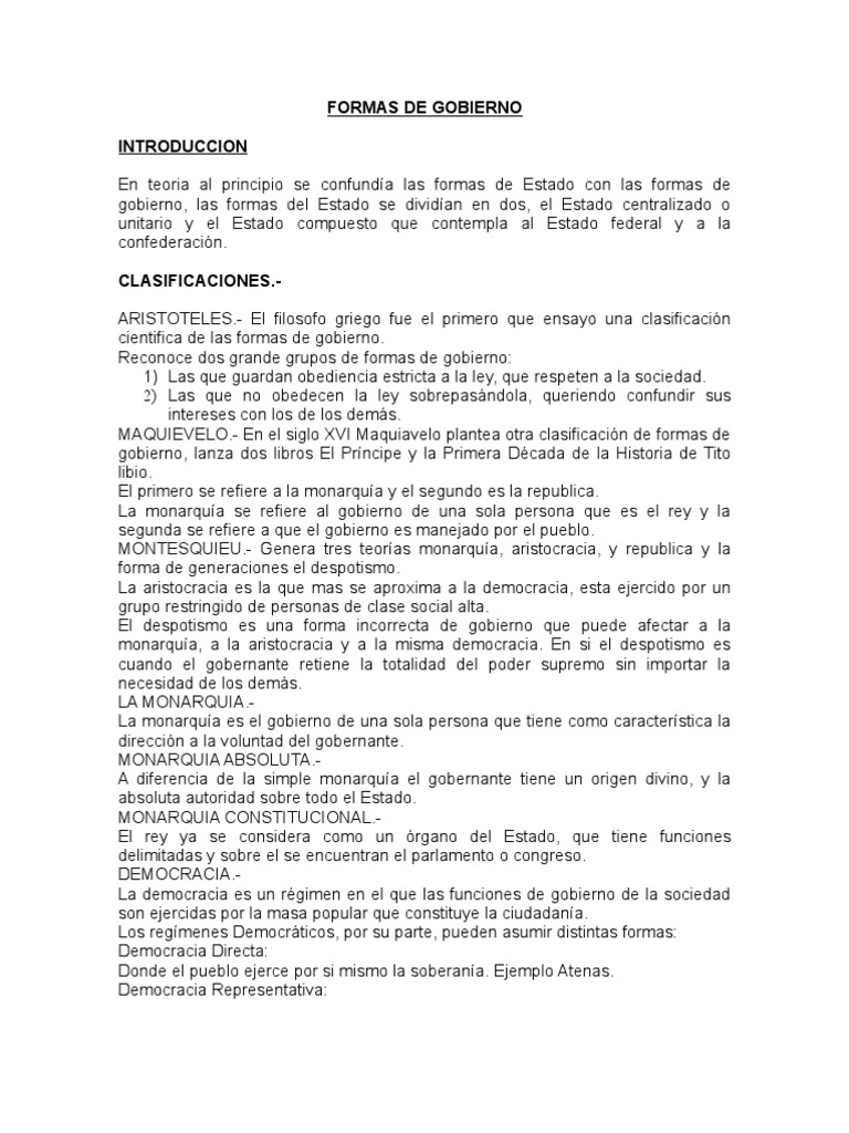 gobierno, las formas del Estado se dividían en dos, el Estado centralizado o