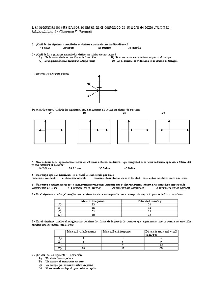 Las preguntas de esta prueba se basan en el contenido de su libro de texto Fsica sin Matemticas de Clarence E. Bennett.
