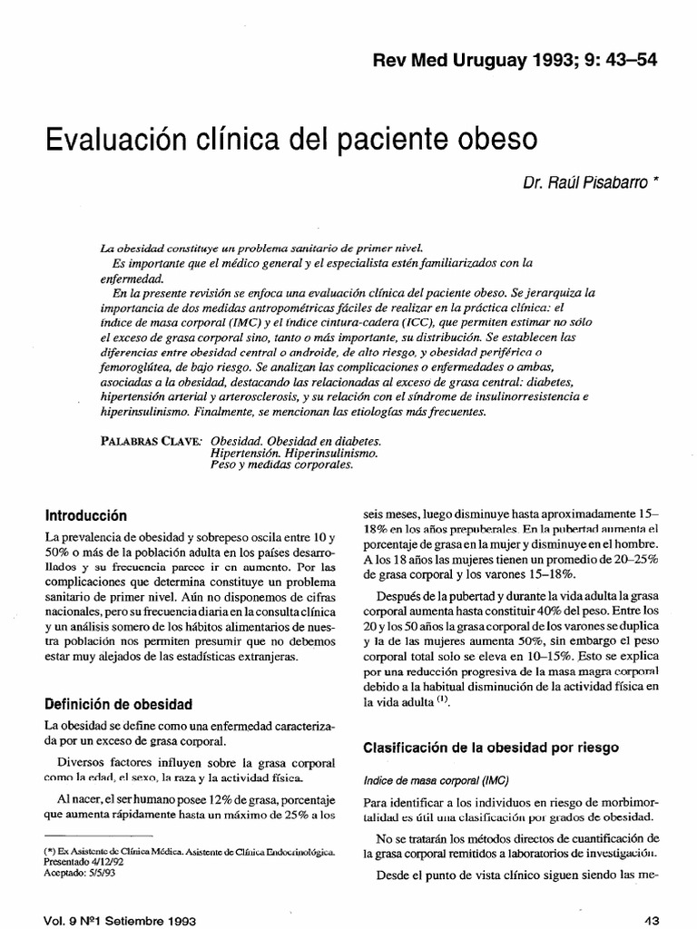 La obesidad constituye un problema sanitario de primer nivel. Es importante que el mdico general y el especialista estn familiarizados con la enfermedad. En la presente revisin se enfoca una evaluacin clnica del paciente obeso. Sejerarquiza la kmportancia de dos medirlas antropomhricas fdciles de realizar en la practica clinica: el ndice de masa corporal (IMC} y el ndice cintura-cadera (ICC), que permiten estimar no slo el exceso de grasa corporal sino, tanto o mds importante, su distribucin. Se establecen las diferencias entre obesidad central o androide, de alto riesgo, y obesidad perifrica o femorogltea, de bajo riesgo. Se analizan las complicaciones o enfermedades o ambas, asociadas a la obesidad, destacando las relacionadas al exceso de grasa central: diabetes, hipertensin arterial y arterosclerosis, y su relacin con el sndrome de insulinorresistencia e hiperinsulinismo. Finalmente, se mencionan las etiologas ms frecuentes.