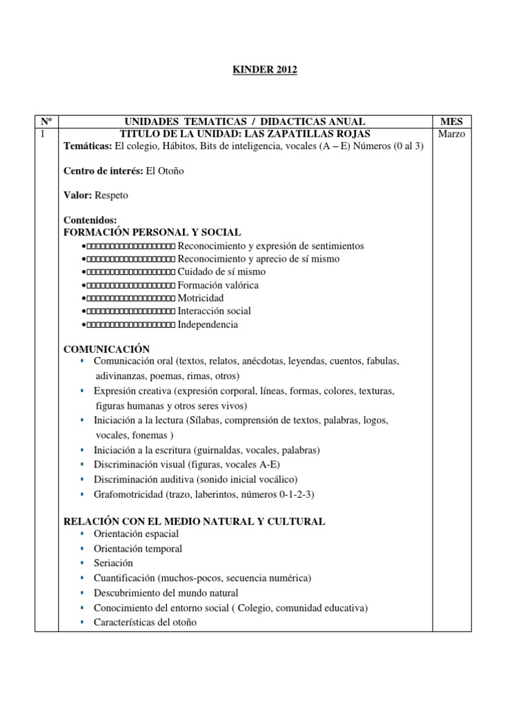 UNIDADES TEMATICAS / DIDACTICAS ANUAL TITULO DE LA UNIDAD: LAS ZAPATILLAS ROJAS Temticas: El colegio, Hbitos, Bits de inteligencia, vocales (A E) Nmeros (0 al 3) Centro de inters: El Otoo Valor: Respeto Contenidos: FORMACIN PERSONAL Y SOCIAL Reconocimiento y expresin de sentimientos Reconocimiento y aprecio de s mismo Cuidado de s mismo Formacin valrica Motricidad Interaccin social Independencia COMUNICACIN Comunicacin oral (textos, relatos, ancdotas, leyendas, cuentos, fabulas, adivinanzas, poemas, rimas, otros) Expresin creativa (expresin corporal, lneas, formas, colores, texturas, figuras humanas y otros seres vivos) Iniciacin a la lectura (Slabas, comprensin de textos, palabras, logos, vocales, fonemas ) Iniciacin a la escritura (guirnaldas, vocales, palabras) Discriminacin visual (figuras, vocales A-E) Discriminacin auditiva (sonido inicial voclico) Grafomotricidad (trazo, laberintos, nmeros 0-1-2-3) RELACIN CON EL MEDIO NATURAL Y CULTURAL Orientacin espacial Orientacin temporal Seriacin Cuantificacin (muchos-pocos, secuencia numrica) Descubrimiento del mundo natural Conocimiento del entorno social ( Colegio, comunidad educativa) Caractersticas del otoo