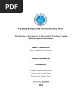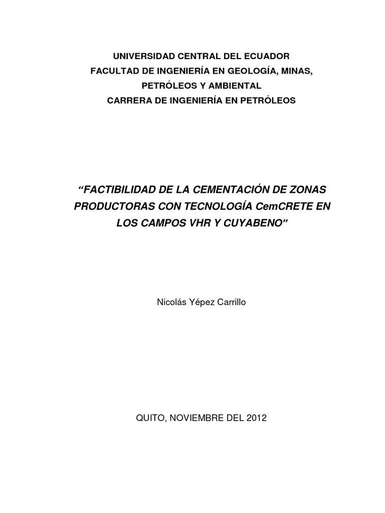 UNIVERSIDAD CENTRAL DEL ECUADOR FACULTAD DE INGENIERA EN GEOLOGA, MINAS, PETRLEOS Y AMBIENTAL CARRERA DE INGENIERA EN PETRLEOS FACTIBILIDAD DE LA CEMENTACIN DE ZONAS PRODUCTORAS CON TECNOLOGA CemCRETE EN LOS CAMPOS VHR Y CUYABENO Autor: Nicols Ypez Tutor: Ing. Benigno Trujillo Fecha: 12 de Noviembre de 2012 RESUMEN Durante la perforacin de pozos, una parte fundamental es la cementacin de cada una de las secciones programadas y as lograr un aislamiento de las formaciones y evitar posibles derrumbes o prdida del pozo. Esta tesis es sobre cementacin de pozos, especficamente enfocado a las lechadas convencionales utilizadas en un grupo de 19 pozos, operaciones hechas por Well Services de Schlumberger en el Oriente Ecuatoriano, analizar y realizar la comparacin con nuevas tecnologas y diseos de lechadas para la cementacin de pozos en Ecuador. Como objetivo general es establecer la factibilidad del uso del cambio de lechadas convencionales por lechadas con alto contenido de slidos, tecnologa CemCRETE. Hiptesis: En el anlisis de lechadas de cemento, se podr conocer la efectividad de la lechada con altos contenidos de slidos de las lechadas convencionales que se han utilizado en los pozos perforados en VHR y Cuyabeno hasta el 2010. El estudio servir de gua para las cementaciones durante las perforaciones de los pozos en los siguientes aos, as tambin analizar esta tcnica y evitar una mala cementacin, con la presencia de porosidad en el cemento cuando este se frage, ruptura del cemento durante completaciones o disparos en la zona productora. El anlisis de costos se realiza en comparacin entre la tecnologa CemCRETE y la cementacin convencional, dando a conocer las ventajas de la utilizacin de la tecnologa en los campos VHR y Cuyabeno.
