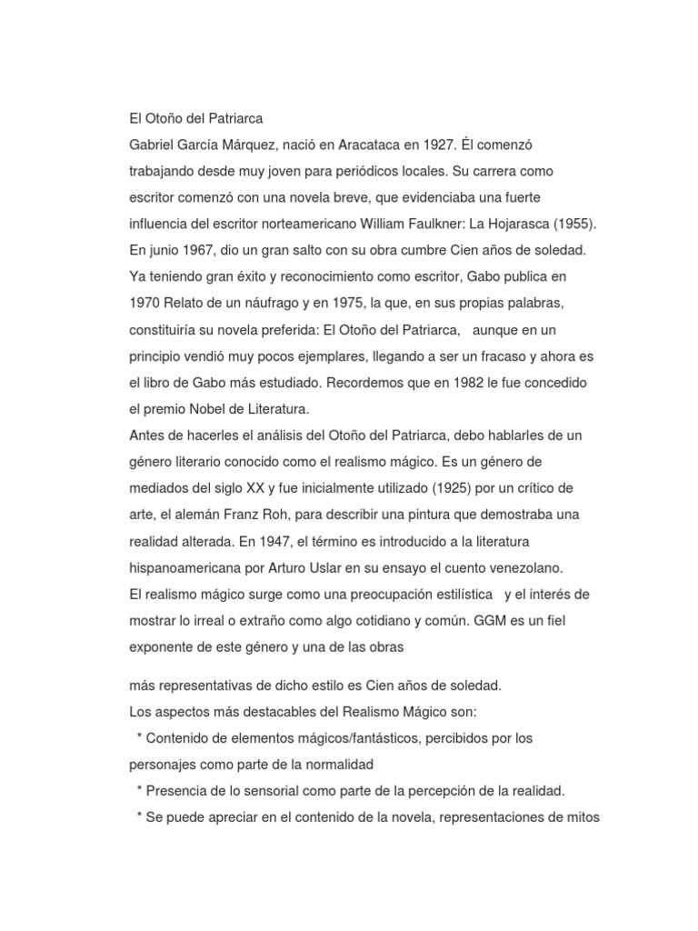 l comenz trabajando desde muy joven para peridicos locales. Su carrera como escritor comenz con una novela breve, que evidenciaba una fuerte influencia del escritor norteamericano William Faulkner: La Hojarasca (1955). En junio 1967, dio un gran salto con su obra cumbre Cien aos de soledad. Ya teniendo gran xito y reconocimiento como escritor, Gabo publica en 1970 Relato de un nufrago y en 1975, la que, en sus propias palabras, constituira su novela preferida: El Otoo del Patriarca, aunque en un principio vendi muy pocos ejemplares, llegando a ser un fracaso y ahora es el libro de Gabo ms estudiado. Recordemos que en 1982 le fue concedido el premio Nobel de Literatura. Antes de hacerles el anlisis del Otoo del Patriarca, debo hablarles de un gnero literario conocido como el realismo mgico. Es un gnero de mediados del siglo XX y fue inicialmente utilizado (1925) por un crtico de arte, el alemn Franz Roh, para describir una pintura que demostraba una realidad alterada. En 1947, el trmino es introducido a la literatura hispanoamericana por Arturo Uslar en su ensayo el cuento venezolano. El realismo mgico surge como una preocupacin estilstica y el inters de mostrar lo irreal o extrao como algo cotidiano y comn. GGM es un fiel exponente de este gnero y una de las obras ms representativas de dicho estilo es Cien aos de soledad. Los aspectos ms destacables del Realismo Mgico son: * Contenido de elementos mgicos/fantsticos, percibidos por los personajes como parte de la normalidad * Presencia de lo sensorial como parte de la percepcin de la realidad. * Se puede apreciar en el contenido de la novela, representaciones de mitos