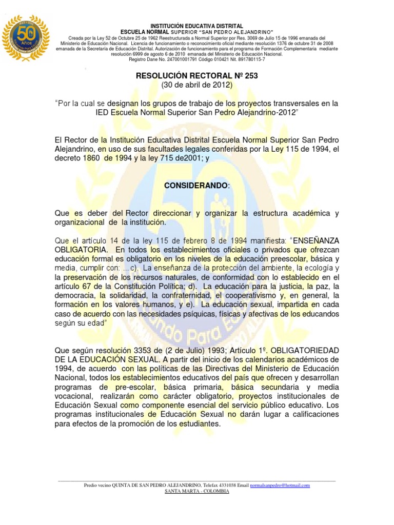 RESOLUCIN RECTORAL N 253 (30 de abril de 2012) Por la cual se designan los grupos de trabajo de los proyectos transversales en la IED Escuela Normal Superior San Pedro Alejandrino-2012