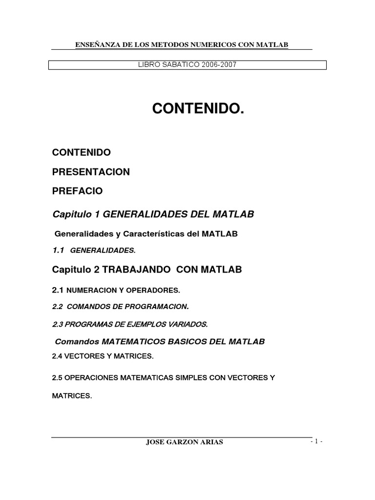 ENSEANZA DE LOS METODOS NUMERICOS CON MATLAB El uso del software especializado, permiten implementar los algoritmos en computadora . Hay ya muchos paquetes matemticos , que contienen libreras especificas de los mtodos, mas usuales , es decir algoritmos clsicos que pueden ser manejados por ingenieros, en diversos campos de aplicacin o a nivel administrativo , aun cuando sean operados por no especialistas; tal es el caso de GNU librera cientfica o bien las libreras, IMSL y NAG . Otro lenguaje popular para clculos numricos es el Matlab , que ser el que se utilizara en el presente texto.