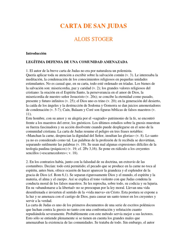 Introduccin LEGTIMA DEFENSA DE UNA COMUNIDAD AMENAZADA 1. El autor de la breve carta de Judas no era por naturaleza un polemista. Quera aplicar toda su atencin a escribir sobre la salvacin comn (v. 3). Le interesaba la meditacin, la condensacin de los conocimientos religiosos en pequeas unidades estimulantes. No es casual que, en su carta, todo est ordenado en tradas. Los bienes de la salvacin son: misericordia, paz y caridad (v. 2); los grandes valores religiosos del cristiano: la oracin en el Espritu Santo, la perseverancia en el amor de Dios, la misericordia de nuestro seor Jesucristo (v. 20s); se concibe la eternidad como pasado, presente y futuro infinitos (v. 25); el Dios uno es trino (v. 20); en la generacin del desierto, la cada de los ngeles y la destruccin de Sodoma y Gomorra se dan juicios amonestadores de condenacin (v. 5-7); Can, Balaam y Cor son figuras bblicas de falsos maestros (v. 11). Este hombre, con su amor y su alegra por el sagrado patrimonio de la fe, se encontr frente a los maestros del error, los gnsticos. Los ltimos estudios sobre la gnosis muestran su fuerza fascinadora y su accin disolvente cuando puede desplegarse en el seno de la comunidad cristiana. La carta de Judas resume el peligro en tres frases notables: Manchan la carne, desprecian la dignidad del Seor, insultan las glorias (v. 8). Lo santo ya no es considerado como tal. Las palabras de la profesin de fe recibida se desvirtan, separando sutilmente las palabras (v. 19). Se usan mal algunas expresiones difciles de la teologa paulina (psquicos) (v. 19; cf. 2Pe 3,16). Se pone en ridculo a los creyentes sencillos (escarnecedores; v. 18). 2. En los contrarios haba, junto con la falsedad de su doctrina, un extravo de las costumbres. Decan: todo est permitido; el pecado que se produce en la carne no toca al espritu, antes bien, ofrece ocasin de hacer aparecer la grandeza y el esplendor de la gracia de Dios (cf. Rom 6,1). Se separan rigurosamente Dios y el mundo, el espritu y la materia, el alma y el cuerpo. As se explica el tono violento con que Judas condena la conducta moral de los falsos maestros. Se les reprocha, sobre todo, su codicia y su lujuria. En su abandonarse a la libertad no se preocupan por la ley moral. Llevan una vida desenfrenada e invierten el sentido de la vida nueva en Cristo. Esta postura se expone a la luz y se amenaza con el castigo de Dios, para causar un santo temor en los creyentes y servir a la verdad. La carta de Judas es uno de los primeros documentos de una serie de escritos polmicos que luchan contra la gnosis no tanto con una confrontacin y refutacin cuanto repudindola severamente. Probablemente con este mtodo serva mejor a sus lectores. Esto slo se entiende plenamente si se tienen en cuenta los grandes males que amenazaban la existencia de las comunidades. Se trataba de todo. Sin embargo, el autor