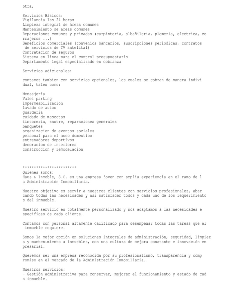 ************************ Quienes somos: Haus & Inmoble, S.C. es una empresa joven con amplia experiencia en el ramo de l a Administracin Inmobiliaria. Nuestro objetivo es servir a nuestros clientes con servicios profesionales, abar cando todas las necesidades y as satisfacer todos y cada uno de los requerimiento s del inmueble. Nuestro servicio es totalmente personalizado y nos adaptamos a las necesidades e specficas de cada cliente. Contamos con personal altamente calificado para desempear todas las tareas que el inmueble requiere. Somos la mejor opcin en soluciones integrales de administracin, seguridad, limpiez a y mantenimiento a inmuebles, con una cultura de mejora constante e innovacin em presarial. Queremos ser una empresa reconocida por su profesionalismo, transparencia y comp romiso en el mercado de la Administracin Inmobiliaria. Nuestros servicios: - Gestin administrativa para conservar, mejorar el funcionamiento y estado de cad a inmueble.