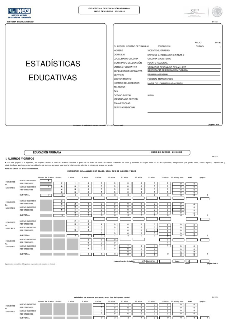 1. En esta pgina y la siguiente, se requiere anotar el total de alumnos inscritos a partir de la fecha de inicio de cursos, sumando las altas y restando las bajas hasta el 30 de septiembre, desglosando por grado, sexo, nuevo ingreso, edad. Verifique que la suma de los subtotales de alumnos por edad sea igual al total; escriba adems el nmero de grupos por grado. Nota: no utilice las reas sombreadas. ESTADSTICA DE ALUMNOS POR GRADO, SEXO, TIPO DE INGRESO Y EDAD