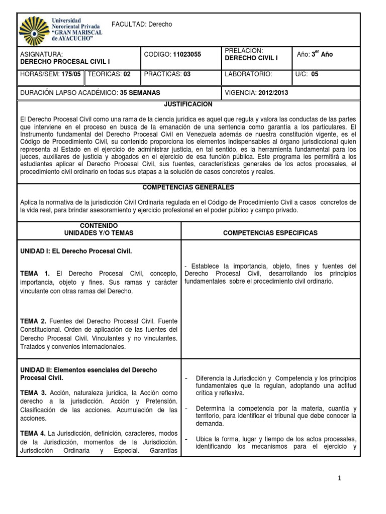 El Derecho Procesal Civil como una rama de la ciencia jurdica es aquel que regula y valora las conductas de las partes que interviene en el proceso en busca de la emanacin de una sentencia como garanta a los particulares. El Instrumento fundamental del Derecho Procesal Civil en Venezuela adems de nuestra constitucin vigente, es el Cdigo de Procedimiento Civil, su contenido proporciona los elementos indispensables al rgano jurisdiccional quien representa al Estado en el ejercicio de administrar justicia, en tal sentido, es la herramienta fundamental para los jueces, auxiliares de justicia y abogados en el ejercicio de esa funcin pblica. Este programa les permitir a los estudiantes aplicar el Derecho Procesal Civil, sus fuentes, caractersticas generales de los actos procesales, el procedimiento civil ordinario en todas sus etapas a la solucin de casos concretos y reales. COMPETENCIAS GENRALES Aplica la normativa de la jurisdiccin Civil Ordinaria regulada en el Cdigo de Procedimiento Civil a casos concretos de la vida real, para brindar asesoramiento y ejercicio profesional en el poder pblico y campo privado. CONTENIDO UNIDADES Y/O TEMAS UNIDAD I: EL Derecho Procesal Civil. - Establece la importancia, objeto, fines y fuentes del Derecho Procesal Civil, desarrollando los principios fundamentales sobre el procedimiento civil ordinario.