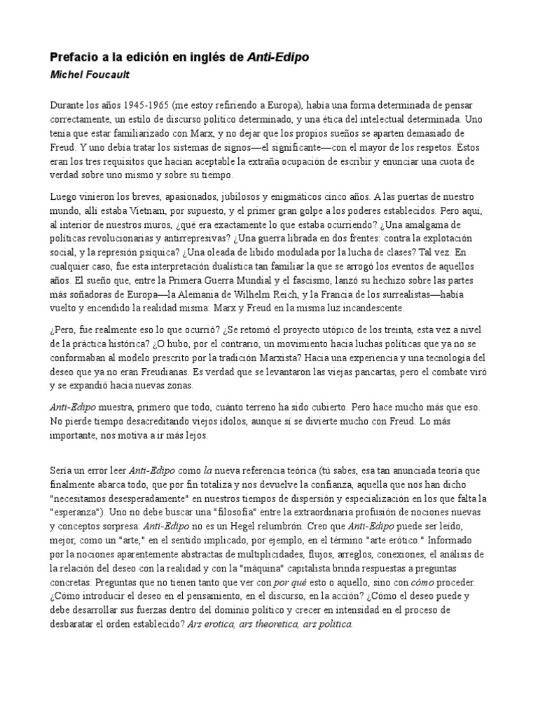 El documento presenta una introducción escrita por Michel Foucault al libro Anti-Edipo de Deleuze y Guattari. Foucault analiza el contexto de los años 1960 y 1970, y cómo el libro propuso nu…