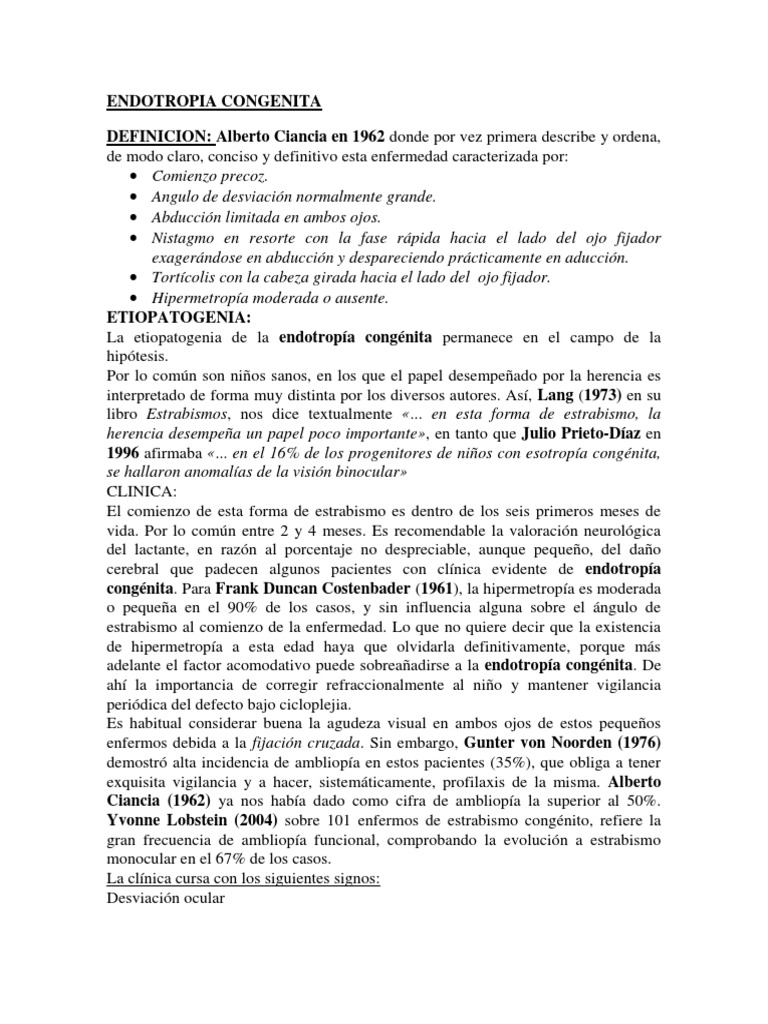 y definitivo esta enfermedad caracterizada por: Comienzo precoz. Angulo de desviacin normalmente grande. Abduccin limitada en ambos ojos. Nistagmo en resorte con la fase rpida hacia el lado del ojo fijador exagerndose en abduccin y despareciendo prcticamente en aduccin. Tortcolis con la cabeza girada hacia el lado del ojo fijador. Hipermetropa moderada o ausente. ETIOPATOGENIA: La etiopatogenia de la endotropa congnita permanece en el campo de la hiptesis. Por lo comn son nios sanos, en los que el papel desempeado por la herencia es interpretado de forma muy distinta por los diversos autores. As, Lang (1973) en su libro Estrabismos, nos dice textualmente ... en esta forma de estrabismo, la herencia desempea un papel poco importante, en tanto que Julio Prieto-Daz en 1996 afirmaba ... en el 16% de los progenitores de nios con esotropa congnita, se hallaron anomalas de la visin binocular CLINICA: El comienzo de esta forma de estrabismo es dentro de los seis primeros meses de vida. Por lo comn entre 2 y 4 meses. Es recomendable la valoracin neurolgica del lactante, en razn al porcentaje no despreciable, aunque pequeo, del dao cerebral que padecen algunos pacientes con clnica evidente de endotropa congnita. Para Frank Duncan Costenbader (1961), la hipermetropa es moderada o pequea en el 90% de los casos, y sin influencia alguna sobre el ngulo de estrabismo al comienzo de la enfermedad. Lo que no quiere decir que la existencia de hipermetropa a esta edad haya que olvidarla definitivamente, porque ms adelante el factor acomodativo puede sobreaadirse a la endotropa congnita. De ah la importancia de corregir refraccionalmente al nio y mantener vigilancia peridica del defecto bajo cicloplejia. Es habitual considerar buena la agudeza visual en ambos ojos de estos pequeos enfermos debida a la fijacin cruzada. Sin embargo, Gunter von Noorden (1976) demostr alta incidencia de ambliopa en estos pacientes (35%), que obliga a tener exquisita vigilancia y a hacer, sistemticamente, profilaxis de la misma. Alberto Ciancia (1962) ya nos haba dado como cifra de ambliopa la superior al 50%. Yvonne Lobstein (2004) sobre 101 enfermos de estrabismo congnito, refiere la gran frecuencia de ambliopa funcional, comprobando la evolucin a estrabismo monocular en el 67% de los casos. La clnica cursa con los siguientes signos: Desviacin ocular