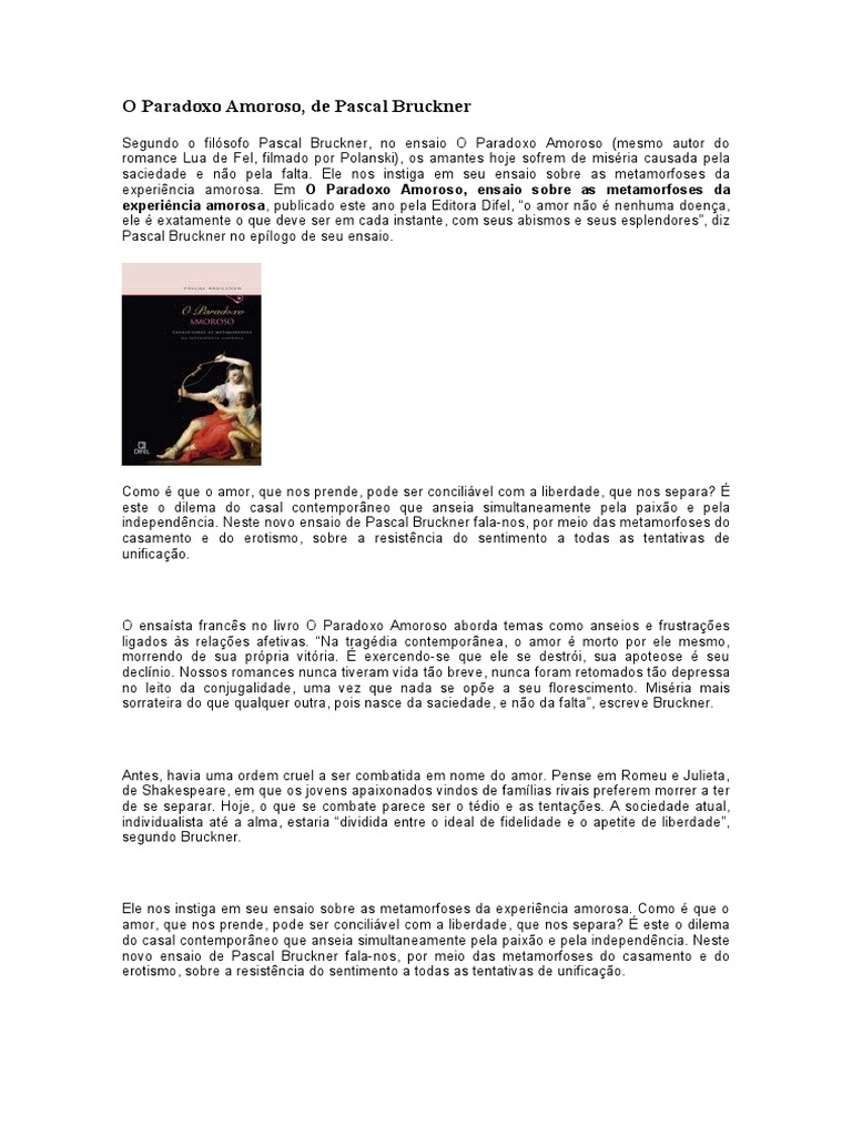 Segundo o filsofo Pascal Bruckner, no ensaio O Paradoxo Amoroso (mesmo autor do romance Lua de Fel, filmado por Polanski), os amantes ho e sofrem de mis!ria causada pela saciedade e n"o pela falta# $le nos instiga em seu ensaio so%re as metamorfoses da experi&ncia amorosa# $m O Paradoxo Amoroso, ensaio sobre as metamorfoses da experincia amorosa, pu%licado este ano pela $ditora 'ifel, (o amor n"o ! nenhuma doen)a, ele ! exatamente o *ue de+e ser em cada instante, com seus a%ismos e seus esplendores,, diPascal Bruckner no ep.logo de seu ensaio#