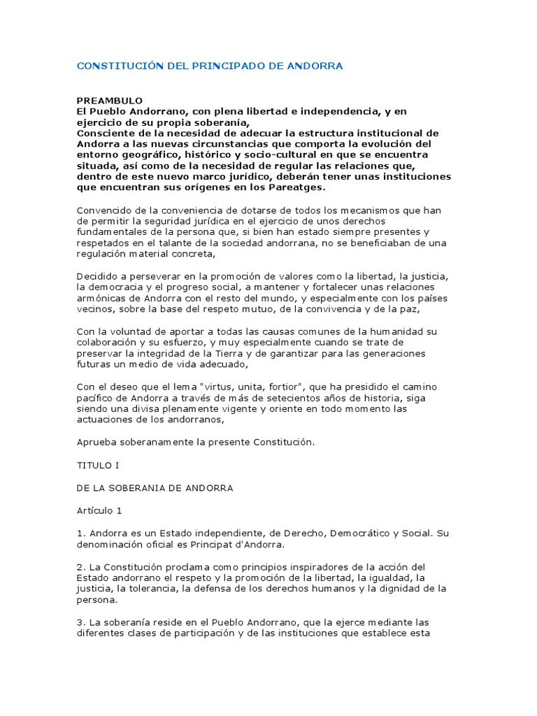 PREAMBULO El Pueblo Andorrano, con plena libertad e independencia, y en ejercicio de su propia soberana, Consciente de la necesidad de adecuar la estructura institucional de Andorra a las nuevas circunstancias que comporta la evolucin del entorno geogrfico, histrico y socio-cultural en que se encuentra situada, as como de la necesidad de regular las relaciones que, dentro de este nuevo marco jurdico, debern tener unas instituciones que encuentran sus orgenes en los Pareatges. Convencido de la conveniencia de dotarse de todos los mecanismos que han de permitir la seguridad jurdica en el ejercicio de unos derechos fundamentales de la persona que, si bien han estado siempre presentes y respetados en el talante de la sociedad andorrana, no se beneficiaban de una regulacin material concreta, Decidido a perseverar en la promocin de valores como la libertad, la justicia, la democracia y el progreso social, a mantener y fortalecer unas relaciones armnicas de Andorra con el resto del mundo, y especialmente con los pases vecinos, sobre la base del respeto mutuo, de la convivencia y de la paz, Con la voluntad de aportar a todas las causas comunes de la humanidad su colaboracin y su esfuerzo, y muy especialmente cuando se trate de preservar la integridad de la Tierra y de garantizar para las generaciones futuras un medio de vida adecuado, Con el deseo que el lema "virtus, unita, fortior", que ha presidido el camino pacfico de Andorra a travs de ms de setecientos aos de historia, siga siendo una divisa plenamente vigente y oriente en todo momento las actuaciones de los andorranos, Aprueba soberanamente la presente Constitucin. TITULO I DE LA SOBERANIA DE ANDORRA Artculo 1 1. Andorra es un Estado independiente, de Derecho, Democrtico y Social. Su denominacin oficial es Principat d'Andorra. 2. La Constitucin proclama como principios inspiradores de la accin del Estado andorrano el respeto y la promocin de la libertad, la igualdad, la justicia, la tolerancia, la defensa de los derechos humanos y la dignidad de la persona. 3. La soberana reside en el Pueblo Andorrano, que la ejerce mediante las diferentes clases de participacin y de las instituciones que establece esta