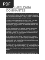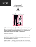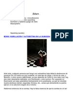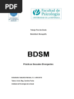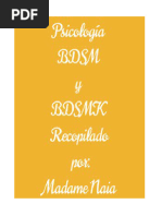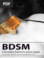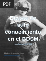 Este documento describe las diversas etapas, sensaciones y emociones que una persona atraviesa para llegar al mundo BDSM. La etapa inicial (del descubrimiento) donde uno descubre sus propias sensaciones. Las sensaciones y las emociones, relacionadas con BDSM pueden emerger en cualquier edad. La gente descubre estas sensaciones despus de un perodo difcil de su vida. Esto es as, probablemente por el hecho de que cuando tales acontecimientos suceden, la gente suele evaluar su propia persona, as como su ambiente. Puesto que el contexto es BDSM, estas sensaciones tienen connotaciones sexuales y pueden casi siempre coincidir con el desarrollo general de la sexualidad de la persona. En esta etapa estas sensaciones no son explcitamente sensaciones BDSM dominantes o sumisas, pero s relacionadas. Las sensaciones Dominantes y sumisas pueden existir muy dentro en la naturaleza delas personas o no. En sentido estricto, no hay persona al 100% Dominante o al 100%sumiso. Lo que desarrolla es una tendencia, hacia un extremo de la escala, Dominante o sumisa. La intensidad de las sensaciones Dominantes o sumisas puede ser diferentes en cada persona. Es confuso qu causa exactamente las diferencias en el desarrollo, aunque los aspectos tienen que ver con la educacin, la libertad de pensamiento, la creatividad, la familia y la religin. Esta etapa est normalmente est marcada por la incertidumbre. La Etapa del Miedo. La incertidumbre y dems factores sociales conducirn al miedo sobre las sensaciones y emociones y puede conducir a perodos ms cortos o ms largos de depresin. Otra vez la religin y la educacin son los factores que influyen aqu, combinadas con los tabes sociales, los prejuicios, los estereotipos y un dficit substancial en la educacin sexual general. Los Dominantes y los sumisos en esta etapa pensarn que son el nico ser, con sensaciones como stas y en casi todos los casos todava no hablan de ellas. Algunos buscarn activamente la informacin, otros ocultarn sus deseos y al mismo tiempo, consolidarn secretamente sus sensaciones. Para la persona implicada, las sensaciones no se identifican como "incorrectas", y s como positivas y especiales y sobre todo "propias". Sin embargo, hay un conflicto directo con los aspectos sociales y el comportamiento polticamente [Link] mujer en la sociedad moderna no se ve como sumisa o dbil, sus fantasas pueden incluir violacin, secuestro, etc , estas mujeres sern vistas por otras mujeres como un peligro para su gnero. Un hombre, por otra parte, puede sentirse asustado de ser marcado como un monstruo o un sdico, si expone sus fantasas. La Primera etapa, donde uno comenzar a experimentar, consigo mismo, lee, y busca informacin. Incluso mientras guardan sus fantasas y sueos para s mismos, la gente comenzar a experimentar, normalmente en s mismos, a veces activamente, incorporando los papeles Dominantes y sumisos en s mismos. La gente comenzar a buscar ms informacin. Esta "informacin" se relacionar lo ms posible con sus fantasas (es decir, buscando libros e historias sobre stas, as como cuadros y sitios de Internet).
