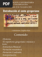 Es un canto mondico, a [Link], texto en latn, de ritmo libre, la msica sirve al texto, mbito meldico reducido y canto de carcter grandiosos, sereno de paz y de alegra contenida. Fue un canto de transmisin oral ayudado con gestos de la mano (quironimia). Se desarroll una notacin musical a base de neumas que ayudaban a recordar y memorizar las melodas. Se utiliza la notacin a campo aperto. En el siglo XI van apareciendo una, dos, tres y hasta cuatro lneas con Guido d Arezzo.