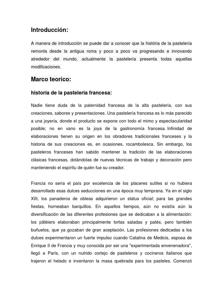 A manera de introduccin se puede dar a conocer que la histria de la pastelera remonta desde la antigua roma y poco a poco va progresando e innovando alrededor del mundo, actualmente la pastelera presenta todas aquellas modificaciones.