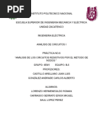 Con los datos de los voltajes en cada nodo podemos obtener las ecuaciones de nodo para cada elemento y obtener los valores tericos para cada uno. Resistencia R1 R2 R3 R4 R5 RT k 0.46 0.325 1 0.324 0.99 V 10.82 9.18 4.75 6.07 13.93 20 I 23.86 28.24 4.75 18.73 14.07 42.31 P 258.16 259.24 22.56 113.69 195.99 846.2 Ecuacin de nodo eA eB eB eD eC eB eA eC eC eD eA eD