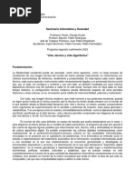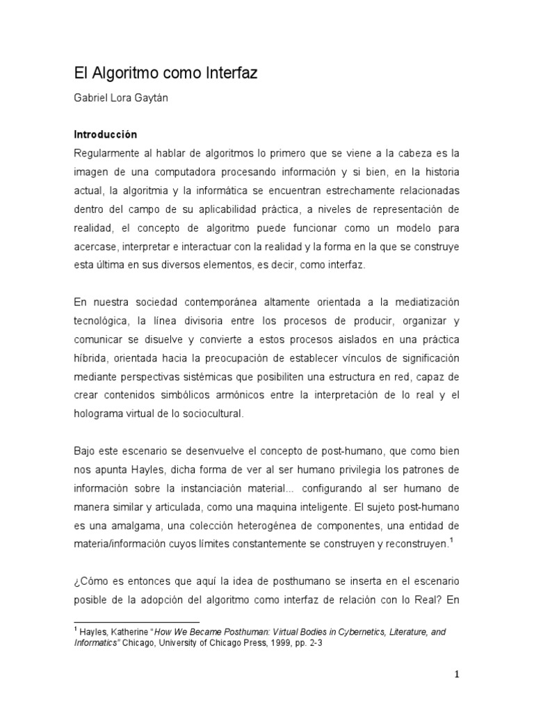 Gabriel Lora Gaytn Introduccin Regularmente al hablar de algoritmos lo primero que se viene a la cabeza es la imagen de una computadora procesando informacin y si bien, en la historia actual, la algoritmia y la informtica se encuentran estrechamente relacionadas dentro del campo de su aplicabilidad prctica, a niveles de representacin de realidad, el concepto de algoritmo puede funcionar como un modelo para acercase, interpretar e interactuar con la realidad y la forma en la que se construye esta ltima en sus diversos elementos, es decir, como interfaz. En nuestra sociedad contempornea altamente orientada a la mediatizacin tecnolgica, la lnea divisoria entre los procesos de producir, organizar y comunicar se disuelve y convierte a estos procesos aislados en una prctica hbrida, orientada hacia la preocupacin de establecer vnculos de significacin mediante perspectivas sistmicas que posibiliten una estructura en red, capaz de crear contenidos simblicos armnicos entre la interpretacin de lo real y el holograma virtual de lo sociocultural. Bajo este escenario se desenvuelve el concepto de post-humano, que como bien nos apunta Hayles, dicha forma de ver al ser humano privilegia los patrones de informacin sobre la instanciacin material! configurando al ser humano de manera similar y articulada, como una maquina inteligente. El sujeto post-humano es una amalgama, una coleccin heterognea de componentes, una entidad de materia/informacin cuyos lmites constantemente se construyen y reconstruyen.1 Cmo es entonces que aqu la idea de posthumano se inserta en el escenario posible de la adopcin del algoritmo como interfaz de relacin con lo Real? En !!!!!!!!!!!!!!!!!!!!!!!!!!!!!!!!!!!!!!!!!!!!!!!!!!!!!!!!