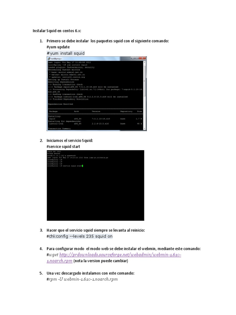 3. Hacer que el servicio squid siempre se levanta al reinicio: #chkconfig --levels 235 squid on 4. Para configurar modo el modo web se debe instalar el webmin, mediante este comando: #wget [Link] (nota la version puede cambiar) 5. Una vez descargado instalamos con este comando: #rpm -U [Link]