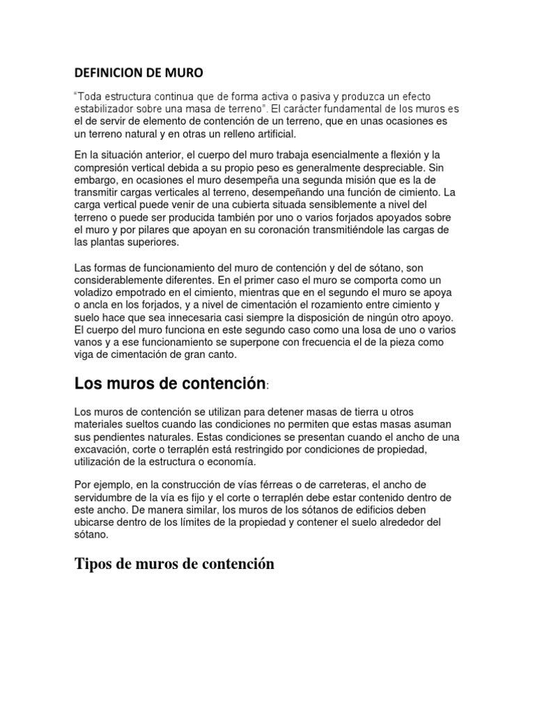 Toda estructura continua que de forma activa o pasiva y produzca un efecto estabilizador sobre una masa de terreno. El carcter fundamental de los muros es el de servir de elemento de contencin de un terreno, que en unas ocasiones es un terreno natural y en otras un relleno artificial. En la situacin anterior, el cuerpo del muro trabaja esencialmente a flexin y la compresin vertical debida a su propio peso es generalmente despreciable. Sin embargo, en ocasiones el muro desempea una segunda misin que es la de transmitir cargas verticales al terreno, desempeando una funcin de cimiento. La carga vertical puede venir de una cubierta situada sensiblemente a nivel del terreno o puede ser producida tambin por uno o varios forjados apoyados sobre el muro y por pilares que apoyan en su coronacin transmitindole las cargas de las plantas superiores. Las formas de funcionamiento del muro de contencin y del de stano, son considerablemente diferentes. En el primer caso el muro se comporta como un voladizo empotrado en el cimiento, mientras que en el segundo el muro se apoya o ancla en los forjados, y a nivel de cimentacin el rozamiento entre cimiento y suelo hace que sea innecesaria casi siempre la disposicin de ningn otro apoyo. El cuerpo del muro funciona en este segundo caso como una losa de uno o varios vanos y a ese funcionamiento se superpone con frecuencia el de la pieza como viga de cimentacin de gran canto.