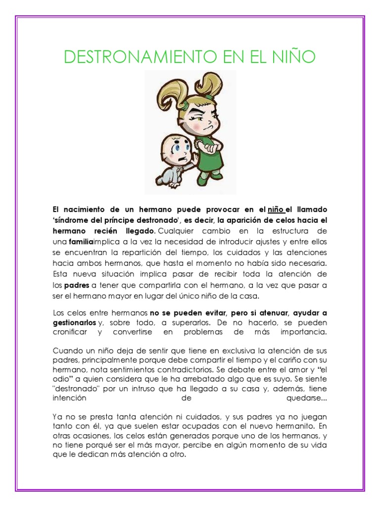 El nacimiento de un hermano puede provocar en el nio el llamado sndrome del prncipe destronado', es decir, la aparicin de celos hacia el hermano recin llegado. Cualquier cambio en la estructura de una familiaimplica a la vez la necesidad de introducir ajustes y entre ellos se encuentran la reparticin del tiempo, los cuidados y las atenciones hacia ambos hermanos, que hasta el momento no haba sido necesaria. Esta nueva situacin implica pasar de recibir toda la atencin de los padres a tener que compartirla con el hermano, a la vez que pasar a ser el hermano mayor en lugar del nico nio de la casa. Los celos entre hermanos no se pueden evitar, pero si atenuar, ayudar a gestionarlos y, sobre todo, a superarlos. De no hacerlo, se pueden cronificar y convertirse en problemas de ms importancia. Cuando un nio deja de sentir que tiene en exclusiva la atencin de sus padres, principalmente porque debe compartir el tiempo y el cario con su hermano, nota sentimientos contradictorios. Se debate entre el amor y el odio a quien considera que le ha arrebatado algo que es suyo. Se siente "destronado" por un intruso que ha llegado a su casa y, adems, tiene intencin de quedarse... Ya no se presta tanta atencin ni cuidados, y sus padres ya no juegan tanto con l, ya que suelen estar ocupados con el nuevo hermanito. En otras ocasiones, los celos estn generados porque uno de los hermanos, y no tiene porqu ser el ms mayor, percibe en algn momento de su vida que le dedican ms atencin a otro.