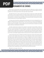 7. EL DESTRONAMIENTO DE CRONO a. Crono se cas con su hermana Rea, a quien est consagrado el roble. Pero la Madre Tierra y su moribundo padre Urano profetizaron que uno de sus hijos lo destronara. En consecuencia, cada ao devoraba a los hijos que le daba Rea: primeramente a Hestia, luego a Demter y Hera, y ms tarde a Hades y Posidn. b. Rea estaba furiosa. Dio a luz a Zeus, su tercer hijo, en plena noche en el monte Liqueo de Arcadia, donde ninguna criatura proyecta su sombra y, despus de baarlo en el ro Neda, lo entreg a la Madre Tierra, quien lo llev a Licto en Creta y lo ocult en la cueva de Dicte en el monte Egeo. La Madre Tierra lo dej all para que lo criaran Adrastea, una ninfa del Fresno, su hermana Io, hijas ambas de Meliseo, y la ninfacabra Amaltea. Se alimentaba de miel y beba la leche de Amaltea, con el chivo Pan, su hermano adoptivo. Zeus estaba agradecido a las tres ninfas por su bondad y cuando lleg a ser el Seor del Universo puso la imagen de Amaltea entre las estrellas, como Capricornio y Tambin tom uno de sus cuernos,