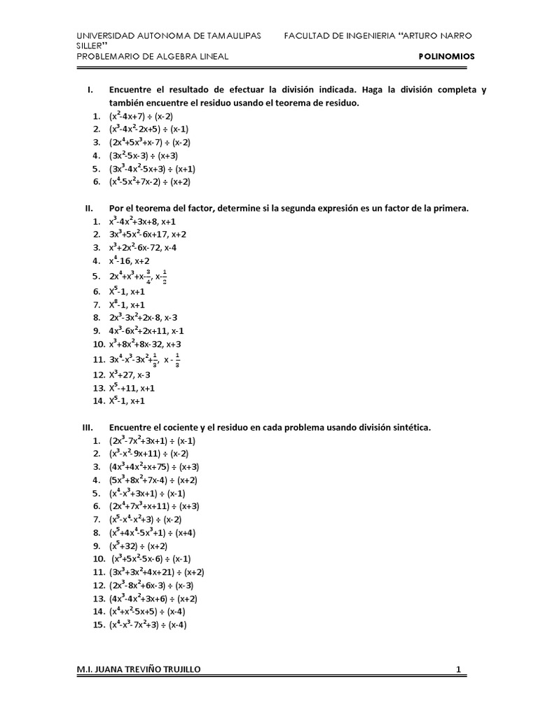 Encuentre el resultado de efectuar la divisin indicada. Haga la divisin completa y tambin encuentre el residuo usando el teorema de residuo. (x2-4x+7) (x-2) (x3-4x2-2x+5) (x-1) (2x4+5x3+x-7) (x-2) (3x2-5x-3) (x+3) (3x3-4x2-5x+3) (x+1) (x4-5x2+7x-2) (x+2) Por el teorema del factor, determine si la segunda expresin es un factor de la primera. x3-4x2+3x+8, x+1 3x3+5x2-6x+17, x+2 x3+2x2-6x-72, x-4 x4-16, x+2 X5-1, x+1 X8-1, x+1 2x3-3x2+2x-8, x-3 4x3-6x2+2x+11, x-1 x3+8x2+8x-32, x+3