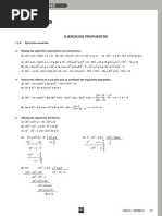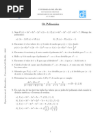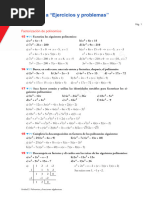 f(x) = x5 5x4 +10x3 10x2 +5x 1 , tomando en cuenta que f(1) = 0. 13. El polinomio f(x) = x4 +4x3 +3x2 8x 10 tiene dos races irracionales. Situar cada una de estas races entre dos nmeros enteros consecutivos. 14. Determinar las races del polinomio p(x) = x4 - 9x3 + 25x2 19x 6 15. Dada la funcin f(t) definida por: f(t) = 256t4 128t3 96t2 + 8t +5 Si x = 4t, calcule El polinomio f(x) y Los valores de t para los cuales f(t) = 0. 16. Calcular el valor de k y las races del polinomio: f(x) = 2x6 + 3x5 + kx4 +15x3 32x2 +12x si x 1 es uno de sus factores. 17. Obtener de los siguientes polinomios: p(x) = 2x9 - 2x7 + 2x5 - 2x3 f(x) = x9 + x6 + x3 + 1 a) Las PRRR b) El nmero mximo y mnimo de races reales positivas, negativas y complejas, usando la regla los signos de Descartes y elaborando la Tabla de Signos c) Determinar las races del polinomio, por Divisin Sinttica d) Expresar el polinomio en forma factorizada e) Enlistar las races f) Indicar cul de las combinaciones de la Tabla de Descartes resulto correcta