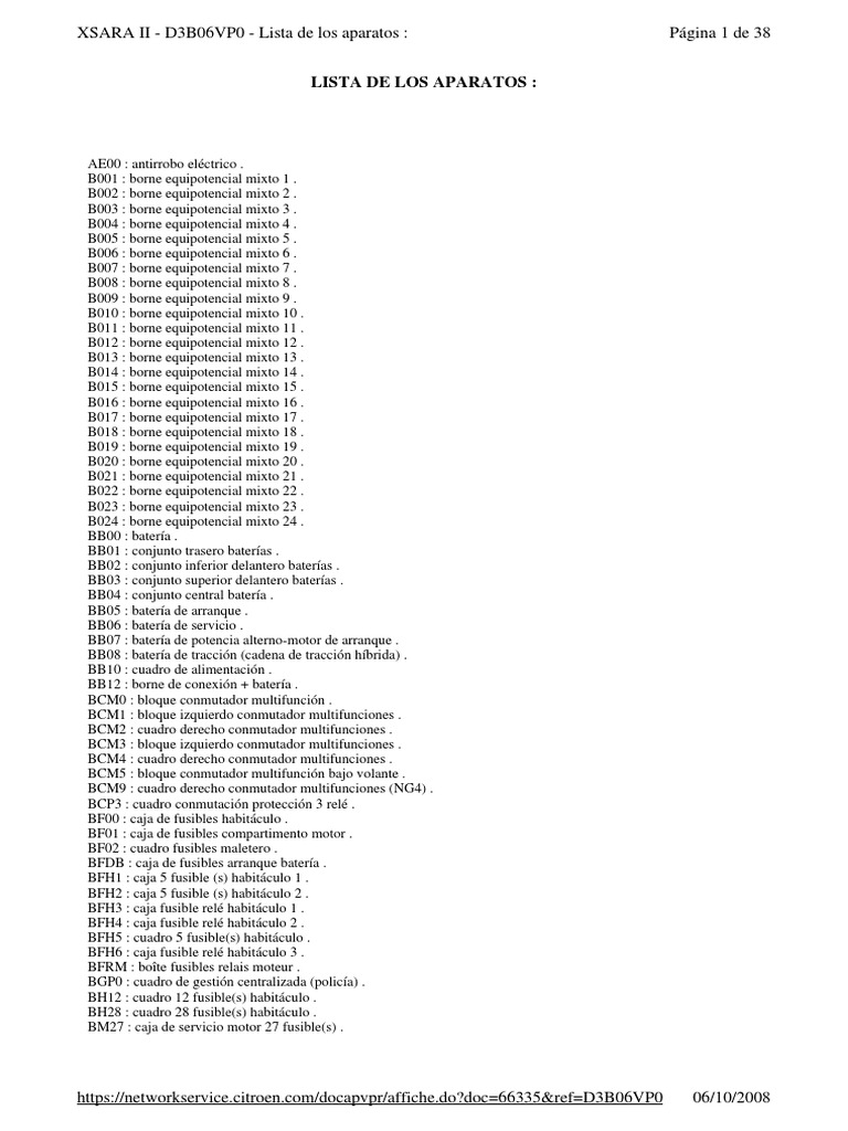 AE00 : antirrobo elctrico . B001 : borne equipotencial mixto 1 . B002 : borne equipotencial mixto 2 . B003 : borne equipotencial mixto 3 . B004 : borne equipotencial mixto 4 . B005 : borne equipotencial mixto 5 . B006 : borne equipotencial mixto 6 . B007 : borne equipotencial mixto 7 . B008 : borne equipotencial mixto 8 . B009 : borne equipotencial mixto 9 . B010 : borne equipotencial mixto 10 . B011 : borne equipotencial mixto 11 . B012 : borne equipotencial mixto 12 . B013 : borne equipotencial mixto 13 . B014 : borne equipotencial mixto 14 . B015 : borne equipotencial mixto 15 . B016 : borne equipotencial mixto 16 . B017 : borne equipotencial mixto 17 . B018 : borne equipotencial mixto 18 . B019 : borne equipotencial mixto 19 . B020 : borne equipotencial mixto 20 . B021 : borne equipotencial mixto 21 . B022 : borne equipotencial mixto 22 . B023 : borne equipotencial mixto 23 . B024 : borne equipotencial mixto 24 . BB00 : batera . BB01 : conjunto trasero bateras . BB02 : conjunto inferior delantero bateras . BB03 : conjunto superior delantero bateras . BB04 : conjunto central batera . BB05 : batera de arranque . BB06 : batera de servicio . BB07 : batera de potencia alterno-motor de arranque . BB08 : batera de traccin (cadena de traccin hbrida) . BB10 : cuadro de alimentacin . BB12 : borne de conexin + batera . BCM0 : bloque conmutador multifuncin . BCM1 : bloque izquierdo conmutador multifunciones . BCM2 : cuadro derecho conmutador multifunciones . BCM3 : bloque izquierdo conmutador multifunciones . BCM4 : cuadro derecho conmutador multifunciones . BCM5 : bloque conmutador multifuncin bajo volante . BCM9 : cuadro derecho conmutador multifunciones (NG4) . BCP3 : cuadro conmutacin proteccin 3 rel . BF00 : caja de fusibles habitculo . BF01 : caja de fusibles compartimento motor . BF02 : cuadro fusibles maletero . BFDB : caja de fusibles arranque batera . BFH1 : caja 5 fusible (s) habitculo 1 . BFH2 : caja 5 fusible (s) habitculo 2 . BFH3 : caja fusible rel habitculo 1 . BFH4 : caja fusible rel habitculo 2 . BFH5 : cuadro 5 fusible(s) habitculo . BFH6 : caja fusible rel habitculo 3 . BFRM : bote fusibles relais moteur . BGP0 : cuadro de gestin centralizada (polica) . BH12 : cuadro 12 fusible(s) habitculo . BH28 : cuadro 28 fusible(s) habitculo . BM27 : caja de servicio motor 27 fusible(s) .