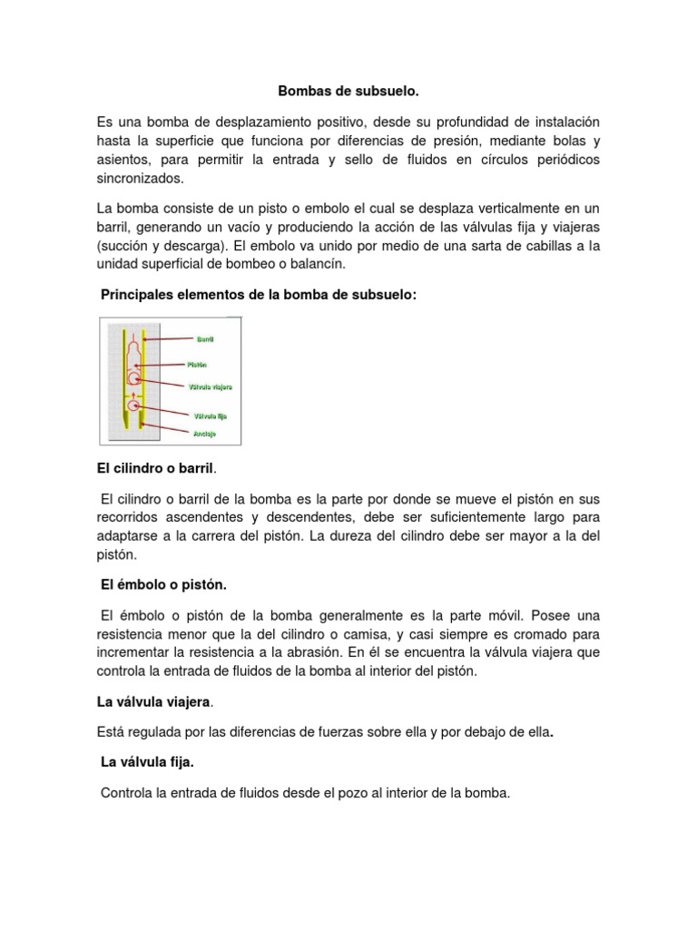 Es una bomba de desplazamiento positivo, desde su profundidad de instalacin hasta la superficie que funciona por diferencias de presin, mediante bolas y asientos, para permitir la entrada y sello de fluidos en crculos peridicos sincronizados. La bomba consiste de un pisto o embolo el cual se desplaza verticalmente en un barril, generando un vaco y produciendo la accin de las vlvulas fija y viajeras (succin y descarga). El embolo va unido por medio de una sarta de cabillas a la unidad superficial de bombeo o balancn. Principales elementos de la bomba de subsuelo: