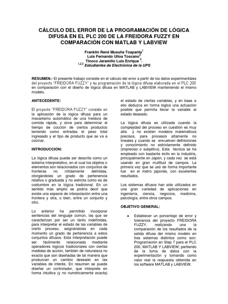 RESUMEN.- El presente trabajo consiste en el clculo del error a partir de los datos experimentales del proyecto FREIDORA FUZZY y su programacin de la lgica difusa elaborada en el PLC 200 en comparacin con el diseo de lgica difusa en MATLAB y LABVIEW manteniendo el mismo modelo. ANTECEDENTE: El proyecto FREIDORA FUZZY consiste en la aplicacin de la lgica difusa para un mecanismo automtico de una freidora de comida rpida, y sirve para determinar el tiempo de coccin de ciertos productos teniendo como entradas el peso total ingresado y el tipo de producto que se va a cocinar. INTRODUCCIN: La lgica difusa puede ser descrita como un sistema interpretativo, en el cual los objetos o elementos son relacionados con conjuntos de fronteras no ntidamente definidas, otorgndoles un grado de pertenencia relativa o graduada y no estricta como es de costumbre en la lgica tradicional. En un sentido ms amplio se podra decir que existe una especie de interpolacin entre una frontera y otra, o bien, entre un conjunto y otro. Lo anterior ha permitido incorporar sentencias del lenguaje comn, las que se caracterizan por ser un tanto indefinidas, para interpretar el estado de las variables de cierto proceso, asignndoles en cada momento un grado de pertenencia a estos conjuntos difusos. Esta interpretacin puede ser fcilmente relacionada mediante operadores lgicos tradicionales con ciertas medidas de accin, tambin de naturaleza no exacta que son diseadas de tal manera que produzcan un cambio deseado en las variables de inters. En resumen se puede disear un controlador, que interprete en forma intuitiva (y no numricamente exacta) el estado de ciertas variables, y en base a ello deduzca en forma lgica una actuacin posible que permita llevar la variable al estado deseado. La lgica difusa es utilizada cuando la complejidad del proceso en cuestin es muy alta y no existen modelos matemticos precisos, para procesos altamente no lineales y cuando se envuelven definiciones y conocimiento no estrictamente definido (impreciso o subjetivo). Esta tcnica se ha empleado con bastante xito en la industria, principalmente en Japn, y cada vez se est usando en gran multitud de campos. La primera vez que se us de forma importante fue en el metro japons, con excelentes resultados. Los sistemas difusos han sido utilizados en una gran variedad de aplicaciones en ingeniera, ciencia, negocios, medicina, psicologa, entre otros campos. OBJETIVO GENERAL: Establecer un porcentaje de error y tolerancia del proyecto FREIDORA FUZZY, realizando una la comparacin de los resultados de la salida difusa del mismo modelo en tres sistemas distintos como son: Programacin en Step 7 para el PLC 200, MATLAB Y LABVIEW; partiendo de la toma de datos con la experimentacin y tomando como valor real la respuesta obtenida en los software MATLAB y LABVIEW.