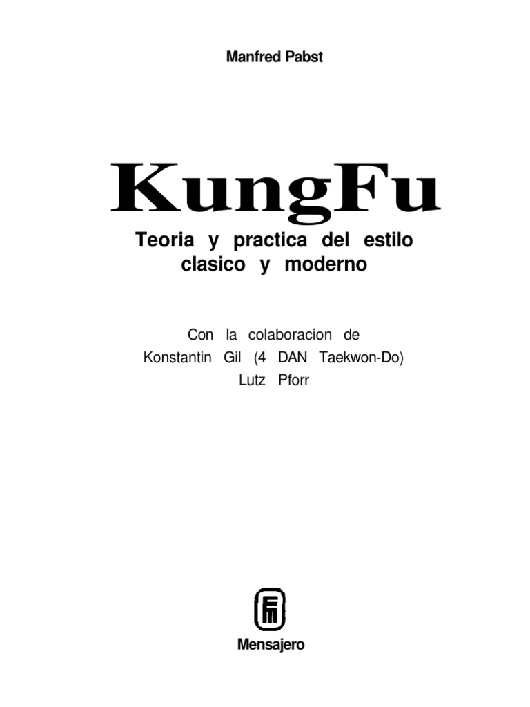 Teora y prctica del estilo clsico y moderno Con numerosos ejercicios y sus correspondientes ilustraciones, este manual expone el moderno sistema Kung Fu, co mo arte marcial y autodefen sa, y al mismo tiempo- la base cultural y religiosa de esta escuela fsica y del carcter, Manfred Pabst, diplomado en Sociologa estudia hace aos los fundamentos tericos y prcticos del antiqusimo arte marcial chino, Shaolin-ssu, hoy conocido como Kung Fu.