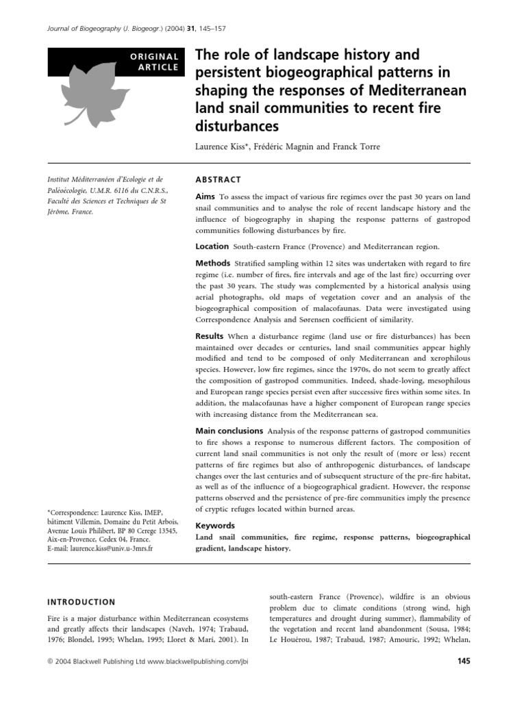 1801) and C.J. Annales de la Socie ´ cial La Garrigue.. (1991) Mollusques continentaux et histoire qua´ diterrane ´ ens (Sud-Est de la France. Leiden. 11–24. 67–74. F. G. Elsevier Science B. Emberger. A. Emberger. M. Solem and A. Backhuys.D. Unpublished Thesis. 15. (1976) Les Paysages Forestiers de Haute ProDougue vence et des Alpes Maritimes. F. A.. J. 611–628. Sauvage. 102–110. R. Long. (1984) The role of disturbance in natural communities.N. Re ´ rou. Magnin. Van Bruggen). (2000) Wildland fire in ecosystems. & Kapler Smith. D. Kiss et al. E. Rocky Mountain Research Station.. L. M. 147. (2003) Evidence for ecological speciation in the sister species Candidula unfasciata (Poiret. A.. New York. R. Z. Kiss. Fire and ecosystems (ed. (1987) The role of fire from paleoecological data. J. (1968) Code ´ me ´thodique de la ve ´ge ´tation et du milieu. Fort Collins. E. 52. Telfer. dite ‘‘Carte de Cassini’’. Centre d’Ecologie et des Ressources Renouvelables.K. (2001) Spatial patterns of forest Dı fires in Catalonia (NE of Spain) along the period 1975–1995. Trabaud and R. E. Wacquant.L. Walla Walla. 1836). pp. & Magnin. & Johannes. ternaire des milieux me ´ d’Aix-Marseille Catalogne). (1974) Carte de la ve Marseille. L. Shikov. 59–70. Van Bruggen). 145–157. (1999) Guide ´. by A. Ecologia Mediterranea. & Legendre. E. M. I. & Smith. (2002) Effects of fire management on the richness and abundance of central North American grassland land snail faunas. Academic Press.P. graphies ae Jongman. Centre National De La Recherche Scientifique. Edn. J. Cameron. pp. O. 13.. Annual Review of Ecolology and Systematics. & Pons. Monspeliensia. A.P. C. (1995) Interior Columbia Basin mollusc species of special concern. Ecologia Mediterranea. Prodon). & Bertrand. Leiden. P. M.. Kozlowski and C. (1995) Data analysis in community and landscape ecology. Interior Columbia Basin Ecosystem Management Project. F. 157–171. Paris. & Trabaud.J. J. Cambridge.F. & Magnin. by A. Forest Ecology and Management. Schreiner. (1991) Randomization and Monte Carlo methods in biology. Forest Ecology and Management. 34. F. WI. 3. 237– 248. (1987) Vegetation wildfires in the MediLe Houe terranean basin: evolution and trends. ´ de la vie animale dans la garDelmas. (1999) Un escargot nouveau venu dans le Luberon et en Provence: Xeropicta derbentina (Krinicki. 353– 391. CO. T. Centre National de la Recherche re Scientifique. Statistiques Logiciel Pe ´ dagogie. 69. Cambridge University Press. Fire and biological processes (ed.. Gastropoda). Nekola. C. 79. 249–259. Analysis of the vegetation recovery after fire. W. F. M. 156 Legendre. by L. (1984) Effects of land use changes on the land mollusc fauna in the central portion of the Russian plain. d’exploration des donne Ivry-sur-Seine. Kerney. Institut Ge Mylonas. Geographie – Ecologie – Histoire. Leiden. Amsterdam. N° spe ´az-Delgado.. rigue. Masson & Cie. (1958) La diversite ´te ´ d’Histoire Naturelle de l’He ´rault. (2000) Wildland fire in ecosystems. Delachaux et Niestle Lausanne. J. (2002) Impact of fire on land snail communities in the French Mediterranean region: preliminary results. Effects of fire on fauna. Ahlgren).. Frest. ´ge ´tation de la France. R.G. X. Edn.F. ´ droit. Martin. (1974) Effects of fire in the Mediterranean Region. Second English edn. Solem and A. 155–163. (2003) The impact of fire on some land snail communities and patterns of post-fire recolonisation. 141..A.H. ´ ographique National (1999) Carte ge ´ome ´trique de la Institut Ge France. Courrier Scientifique du Parc Naturel ´gional de Luberon. Eppenstein. F. Brill.S. Magnin.. London.. 53–66. L. of human impacts and climatic changes. 25. Actes du Colloque: Dynamiques ´diterrane ´ens environnementales et Histoire en domaines me (Paris 2002) (in press). Animal Biodiversity and Conservation. Paris. pour le releve C. ª 2004 Blackwell Publishing Ltd .T. Sousa. pp. Toulouse. N° Hors se Huff. F. Godron. 197–213. Naturalia plus particulie ´ rie. Daget. pp. EDISUD. M. World-wide snails – biogeographical studies on non-marine Mollusca (ed. Journal of Biogeography 31. World-wide snails – biogeographical studies on non-marine Mollusca (ed. Journal of Molluscan Studies.C. ´ ographique National (2001) Campagne de photoInstitut Ge ´riennes 1949 a ` 1998. US Department of Agriculture Forest Service. & Van Tongeren. le logiciel ´es.J. Universite II. L.N. (1971) Travaux de Botanique et d’Ecologie. (2003) Land snails and human impact: the temporal resolution of the Holocene assemblages. Effects of fire on fauna. n° 74 Molinier. (1998) Numerical ecology. 1831) (Helicellinae. Kiss. Paris. & Rey. Aix-en-Provence. & Kiss. ´ centes Guillerm.C. & Thinon.. teer Braak.C. Aix-en-Provence. (1984) The influence of man: a special problem in the study of the zoogeography of terrestrial molluscs on the Aegean islands. Final Report Contract #430E00-4-9112. F. (2001) A comparison of the medieval and Lloret. General Technical Report RMRS-GTR-42. Pons. I. C. H. US Department of Agriculture Forest Service. 3–11. Paris. Lyon. S..G. Dupias.R. L. ´ ographique National. (1992) The dynamics of land gastropod communities in Mediterranean France during the Holocene: effects ´soge ´e. & Magnin.N. Naveh. (1980) Les interventions re ´ ge ´ tation au nord de la me ´ diterrane ´ e et de l’homme sur la ve ` rement dans le sud de la France.. L. 401–434. Le Floc’h. Biological Journal of the Linnean Society.J.N. L.R. P.J. by T. Labaune. M.. Marseille. Rocky Mountain Research Station. Brill. E. CO. Huff. (1985) Document pour un zonage des ´gions phyto-e ´cologiques. J. ´.J.L.. Magnin. Chapman and Hall. & Poissonnet. Pfenninger. R.F.E. P.V. M. Me Manly.G. General Technical Report RMRSGTR-42. Fort Collins. SLP Statistique Jambu (1994) STATlab by slp. G. E. des escargots et des limaces d’Europe. G.H. & Magnin. B. & Marı the current fire regimes in managed pine forest o