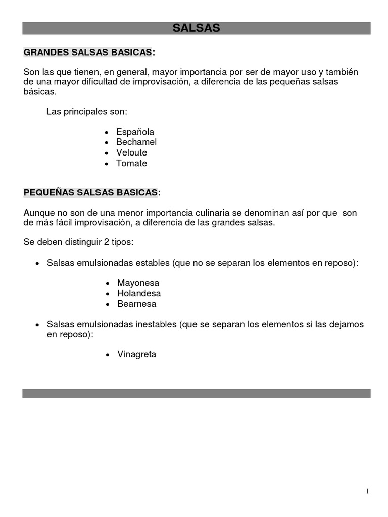 PEQUEAS SALSAS BASICAS: Aunque no son de una menor importancia culinaria se denominan as por que son de ms fcil improvisacin, a diferencia de las grandes salsas. Se deben distinguir 2 tipos: Salsas emulsionadas estables (que no se separan los elementos en reposo): Mayonesa Holandesa Bearnesa Salsas emulsionadas inestables (que se separan los elementos si las dejamos en reposo): Vinagreta