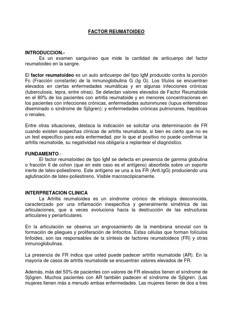 [Link] un examen sanguneo que mide la cantidad de anticuerpo del factor reumatoideo en la sangre. El factor reumatoideo es un auto anticuerpo del tipo IgM producido contra la porcin Fc (Fraccin constante) de la inmunoglobulina G (Ig G). Los ttulos se encuentran elevados en ciertas enfermedades reumticas y en algunas infecciones crnicas (tuberculosis, lepra, entre otras). Se detectan valores elevados de Factor Reumatoide en el 80% de los pacientes con artritis reumatoide y en menores concentraciones en los pacientes con infecciones crnicas, enfermedades autoinmunes (lupus eritematoso diseminado o sndrome de Sjgren); y enfermedades crnicas pulmonares, hepticas o renales. Entre otras situaciones, destaca la indicacin se solicitar una determinacin de FR cuando existen sospechas clnicas de artritis reumatoide, si bien es cierto que no es un test especfico para esta enfermedad, por lo que el positivo no puede confirmar la artritis reumatoide, su negatividad nos obligara a replantear el diagnstico. [Link] factor reumatoideo de tipo IgM se detecta en presencia de gamma globulina o fraccin II de cohon (que en este caso es el antgeno) absorbida sobre un soporte inerte de latex-poliestireno. Este antgeno se una a los FR ([Link]) produciendo una aglutinacin de latex-poliestireno. Visible macroscpicamente.