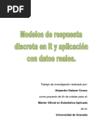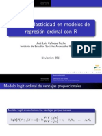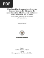 GENERACIN DE MODELOS ARMA y ARIMA: 7) Para simular una serie de acuerdo con un modelo ARMA prefijado: x <- arima.sim(n=10000,model=list(ar=c(0.3,0.6),ma=c(2,3)),sd=1) 8) Para simular una serie de acuerdo con un modelo ARIMA prefijado: x<-arima.sim(10000,model=list(order=c(2,1,0), ar=c(0.7,0.1)),sd=1) 9) Para diferenciar una serie: x1<-diff.ts(x) La diferenciacin se deshace con diffinv(x,lag,xi) 10) Ejercicios: 1. Generar proceso AR(1) con 1 =0.9 y -0.9 2. Generar procesos AR(2), con los siguiente valores de los parmetros: (a) 1 = 0.3 , 2 = 0.6 (poner siempre 2 = 1 ; generar 10000 observaciones) (b) 1 = 0.3 , 2 = 0.6 (c) 1 = 0.4 , 2 = 0.5 En cada caso, representar la funcin de autocorrelacin. Comparar los grficos obtenidos. Qu ocurre si se intenta generar un proceso AR(2) con 1 = 0.3 , 2 = 0.9 ?