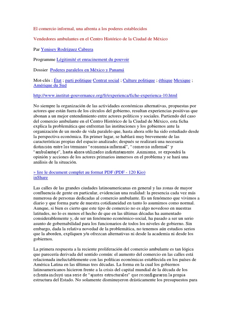 Rodrguez Cabrera Programme Lgitimit et enracinement du pouvoir Dossier Poderes paralelos en Mxico y Panam Mot-cls : tat ; parti politique Contrat social ; Culture politique ; thique Mexique ; Amrique du Sud [Link] No siempre la organizacin de las actividades econmicas alternativas, propuestas por actores que estn fuera de los crculos del gobierno, resultan experiencias positivas que abonan a un mejor entendimiento entre actores polticos y sociales. Partiendo del caso del comercio ambulante en el Centro Histrico de la Ciudad de Mxico, esta ficha explica la problemtica que enfrentan las instituciones y los gobiernos ante la organizacin de un modo de vida paralelo que, hasta ahora slo ha sido estudiado desde la perspectiva econmica. En primer lugar, se hablar muy brevemente de las caractersticas propias del espacio analizado; despus se realizar una necesaria distincin entre los trminos economa informal, comercio informal y ambulantaje, hasta ahora utilizados indistintamente. Asimismo, se expondr la opinin y acciones de los actores primarios inmersos en el problema y se har una anlisis de la situacin. lire le document complet au format PDF (PDF - 120 Kio) inShare Las calles de las grandes ciudades latinoamericanas en general y las zonas de mayor confluencia de gente en particular, evidencian una realidad: la presencia cada vez ms numerosa de personas dedicadas al comercio ambulante. Es un fenmeno que vivimos a diario y que forma parte de nuestra cotidianeidad en tanto lo asumimos como normal. Aunque, si bien es cierto que este tipo de comercio no es algo novedoso en nuestras latitudes, no lo es menos el hecho de que en las ltimas dcadas ha aumentado considerablemente y, de ser un fenmeno econmico-social, ha pasado a ser un serio asunto de gobernabilidad para los funcionarios de todos los niveles de gobierno. Sin embargo, dada la relativa novedad de la problemtica, no tenemos an estudios serios que la aborden, expliquen y/u ofrezcan alternativas ni desde la academia ni desde los gobiernos. La primera respuesta a la reciente proliferacin del comercio ambulante es tan lgica que parecera derivada del sentido comn: el aumento del comercio en las calles est relacionada ineluctablemente con las polticas econmicas establecida en los pases de Amrica Latina en las ltimas tres dcadas. La forma en la cual los gobiernos latinoamericanos hicieron frente a la crisis del capital mundial de la dcada de los ochenta incluy una serie de ajustes estructurales que reconfiguraron la propia estructura del Estado. No solamente disminuyeron drsticamente los presupuestos para