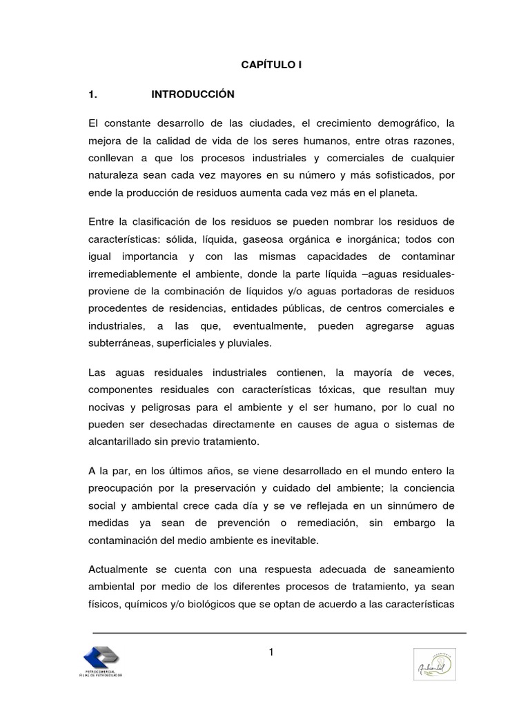 contaminacin del medio ambiente es inevitable. Actualmente se cuenta con una respuesta adecuada de saneamiento ambiental por medio de los diferentes procesos de tratamiento, ya sean fsicos, qumicos y/o biolgicos que se optan de acuerdo a las caractersticas