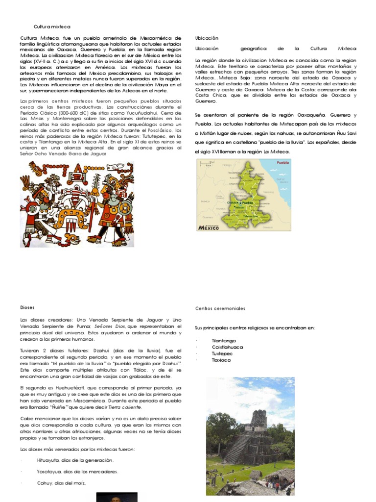 Cultura mixteca Cultura Mixteca, fue un pueblo amerindio de Mesoamrica de familia lingstica otomangueana que habitaron los actuales
