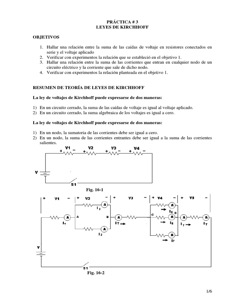RESUMEN DE TEORA DE LEYES DE KIRCHHOFF La ley de voltajes de Kirchhoff puede expresarse de dos maneras: 1) En un circuito cerrado, la suma de las cadas de voltaje es igual al voltaje aplicado. 2) En un circuito cerrado, la suma algebraica de los voltajes es igual a cero. La ley de voltajes de Kirchhoff puede expresarse de dos maneras: 1) En un nodo, la sumatoria de las corrientes debe ser igual a cero. 2) En un nodo, la suma de las corrientes entrantes debe ser igual a la suma de las corrientes salientes.