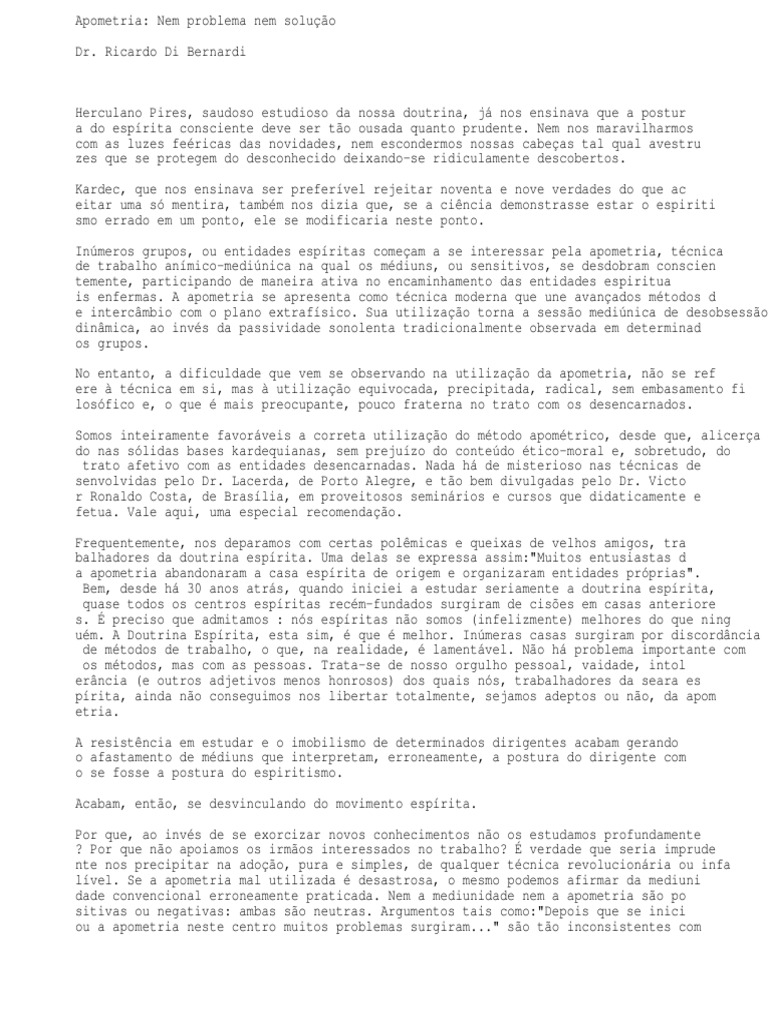o: :"Depois que passou a se envolver com mediunidade necessitou de internao hospitala r em casa de sade mental..." todos ns sabemos que o mal uso das faculdades ou a ig norncia acerca do espiritismo que levam a estes problemas. A falta de apoio recebido, bem como a deficincia no estudo por parte dos envolvid os, aliada a embriaguez pela ofuscante novidade, tem levado muitos grupos esprita s que utilizam a apometria distores que poderiam ser facilmente evitveis. Com todo respeito aos nossos"primos" umbandistas, que executam trabalho srio e til, faz-se necessrio definir algumas fronteiras que devem ser to ntidas quanto fraternas. No h p orque criarmos grupos de umbanda tcnico-cientfica nas casas espritas. Ao invs do clss ico e necessrio" DILOGO COM AS SOMBRAS" to preconizado por Hermnio de Miranda, passa mos a ouvir o contnuo estalar de dedos seguido de verdadeiras expulses dos espritos obsessores ou simplesmente sofredores. O dilogo construtivo e fraterno passou a ser considerado pea de museu. Ao invs de amor e filosofia, muita sonoridade e gest iculao espalhafatosa, sob o argumento de que som serve de veculo para a energia. En to, bater palmas e gritar alto seriam to teis quanto mais ruidosos forem... Natural mente, o impacto energtico seria cada vez mais produtivo quanto mais escandalosa for a sesso... necessrio que acordemos para que logo no estejamos admitindo outras atitudes materiais e perifricas totalmente incompatveis com nossa filosofia. O tra balho espiritual , acima de tudo, mental. Nem tanto ao mar, nem tanto terra: equi lbrio... Desde a poca pr-histrica que hbeis feiticeiros removem obsessores de forma rpida util izando mtodos to eficazes quanto grosseiros. Em pleno sculo XX assim como no se conc ebe rejeitar preconceituosamente novos conhecimentos, da mesma forma no se admite a paixo pelas formas dos frascos coloridos da exteriorizao sensorial em detrimento da essncia filosfica. Tcnicas apomtricas que possibilitam a remoo rpida e objetiva dos"aparelhos parasitas" instalados pelos obsessores no perisprito do obsediado, devem ser assimiladas po r todos ns, interessados no progresso de nossos trabalhos. No entanto, um equvoco freqentemente observado em alguns grupos que utilizam a apo metria, o esquecimento do apoio ao obsedido aps a remoo dos aparelhos s parasitas i nstalados. indispensvel o esclarecimento pelo estudo e a promoo da reforma ntima da pretensa vtima qual no se modificando, logo atrair novos ovbsessores. Obsessores retirados do campo mental do obsediado"a forciori" e enviado a"outros planetas" ou a estranhos locais ou dimenses extrafsicas, talvez merecessem uma at eno mais adequada. A ausncia de dilogo com espritos enfermos, em certos casos, apenas determinar a muda na de endereo dos obsessores, bem como a admisso de novos inquilinos na casa mental desocupada do obsediado. Se est na hora de modernizarmos as sonolentas sesses, onde chega-se a dormir liter almente, imaginando ingenuamente estar se cedendo ectoplasma ou trabalhando em d esdobramento inconsciente o que eventualmente at ocorre), tambm est na hora de no ex agerarmos na postura inversa. Faz-se necessrio recolocarmos a filosofia esprita, o amor e a seriedade nos trabalhos medinicos e no umbandizarmos a doutrina esprita n em brincarmos irresponsavelmente com animadas tcnicas. Na matemtica do trabalho preciso somar a nova tcnica sem subtrair conceitos filosfi cos bsicos evitando divises desnecessrias para multiplicar os resultados na tabuada do amor. Dr. Ricardo Di Bernardi Presidente da AME SC
